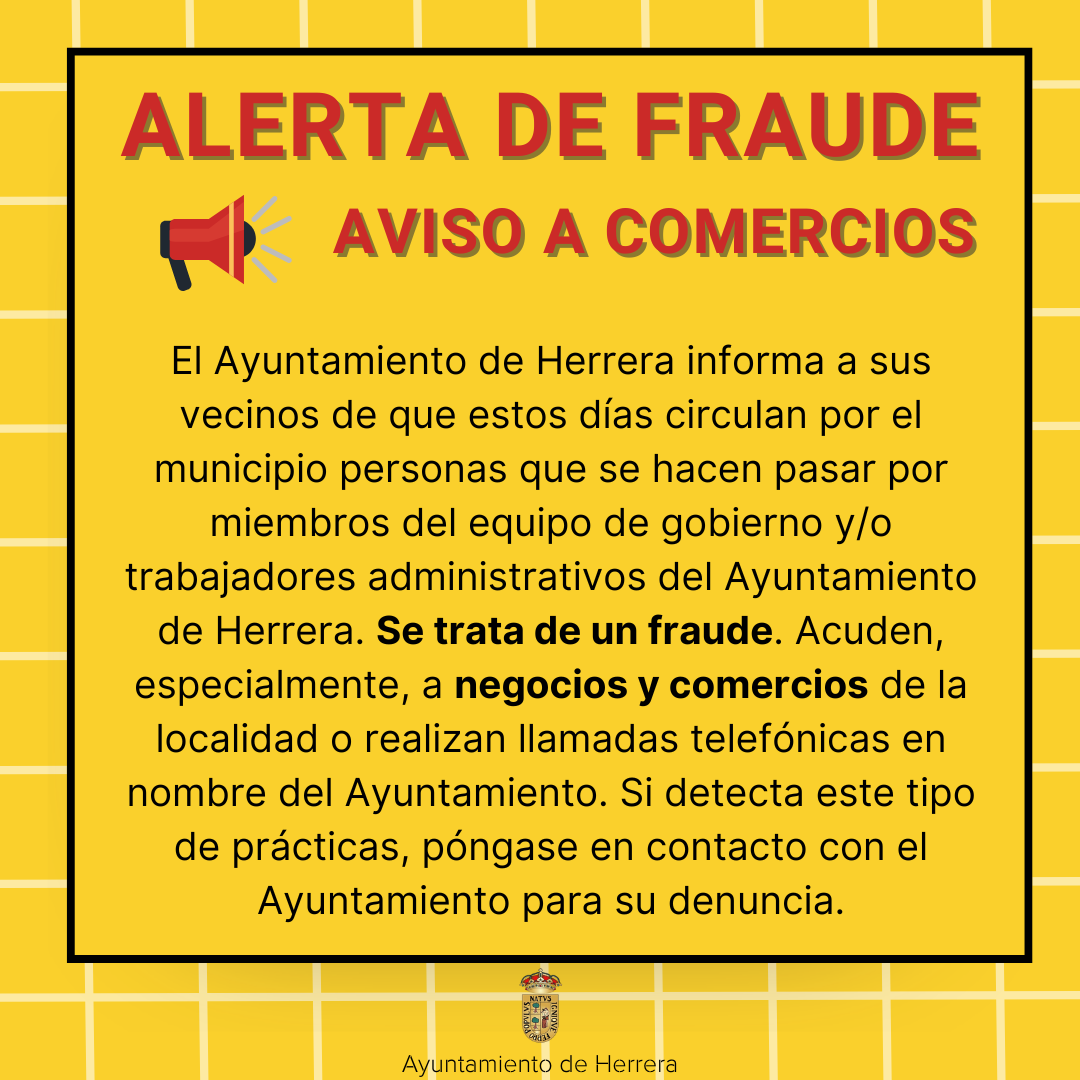 El Ayuntamiento de Herrera informa a sus vecinos de que estos días circulan por el municipio personas que se hacen pasar por miembros del equipo de gobierno y/o trabajadores administrativos del Ayuntamiento de Herrera. Se trata de un fraude. Acuden, especialmente, a negocios y comercios de la localidad o realizan llamadas telefónicas en nombre del Ayuntamiento. Si detecta este tipo de prácticas, póngase en contacto con el Ayuntamiento para su denuncia.