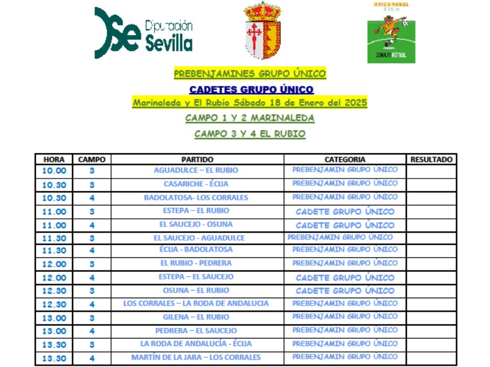 El sábado 18 de enero a partir de las 10 de la mañana Jornada de las categorías PREBENJAMÍN y CADETE en el polideportivo municipal de El Rubio