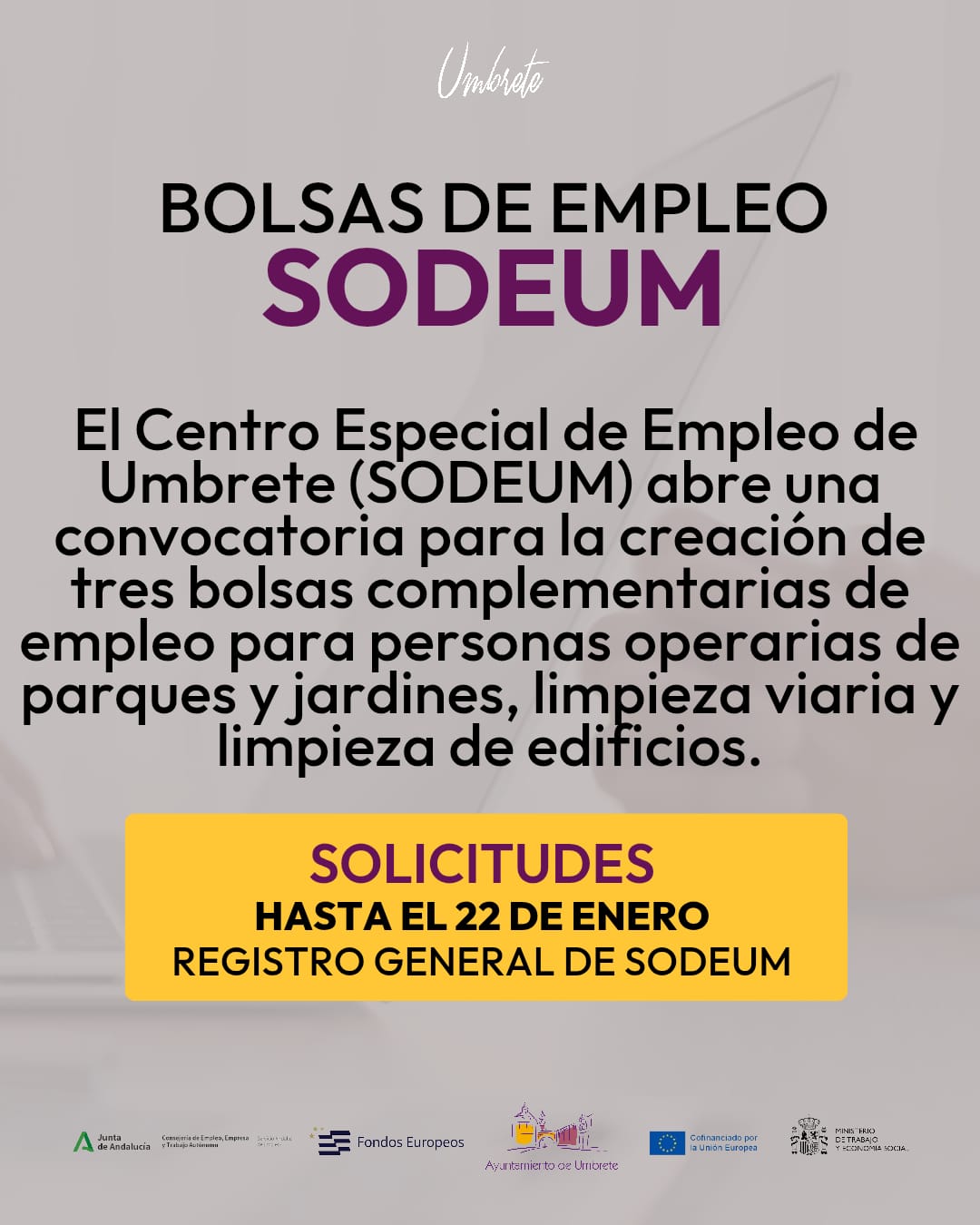 SODEUM (Centro Especial de Empleo de Umbrete) abre una convocatoria para la creación de 3 bolsas complementarias de empleo para personas operarias de parques y jardines, limpieza viaria y limpieza de edificios.