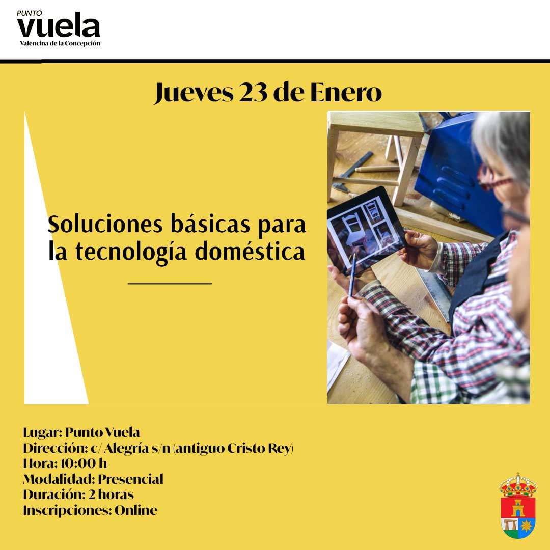 Lugar: Punto Vuela, c/ Alegría s/n (antiguo colegio Cristo Rey) Duración: 2 horas Modalidad: Presencial Objetivos del taller: Descubre cómo tener un hogar digital funcional. Aprende a diagnosticar y solucionar problemas de Wi-Fi. Configura dispositivos móviles y ordenadores desde cero. Aprovecha recursos en línea para soporte técnico. Inscríbete online (plazas limitadas) a través del formulario: