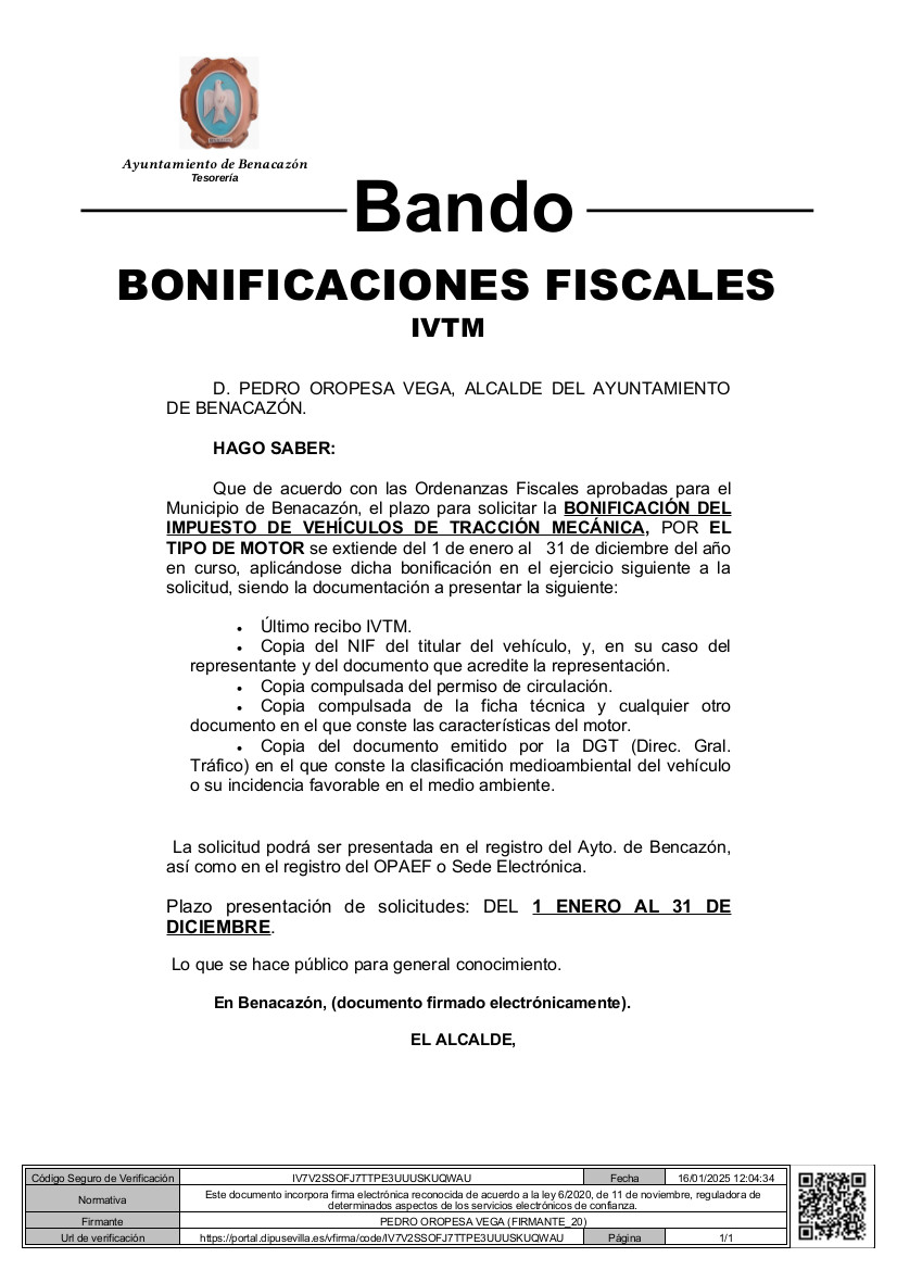 El Ayuntamiento de Benacazón informa sobre la BONIFICACIÓN existente cada año en el IBI URBANA por la INSTALACIÓN DE SISTEMAS PARA EL APROVECHAMIENTO DE ENERGÍA SOLAR, cuyo BANDO informativo adjuntamos en esta publicación destacando que, para poder beneficiarse de dicha bonificación para su aplicación en el Ejercicio de 2026, deberán presentar en el Registro General del Ayuntamiento o en las oficinas del OPAEF la Solicitud correspondiente antes del 31 de Diciembre de 2025 (MODELO 01.02 del OPAEF, adjunto a acontinuación).