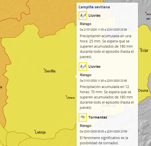 - Aviso amarillo por tormentas de 00.00 a 23.59 horas. El fenómeno significativo es la posibilidad de tornados.
