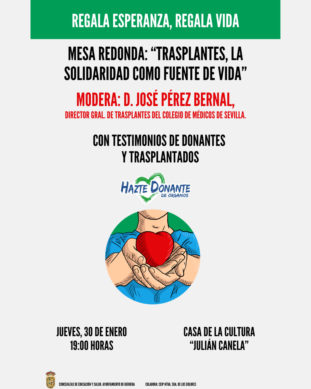 El próximo jueves, 30 de enero, contaremos en nuestra Casa de la Cultura "Julián Canela" con el reconocido médico don José Pérez Bernal, director General de Trasplantes del Real e Ilustre Colegio Oficial de Médicos de Sevilla.