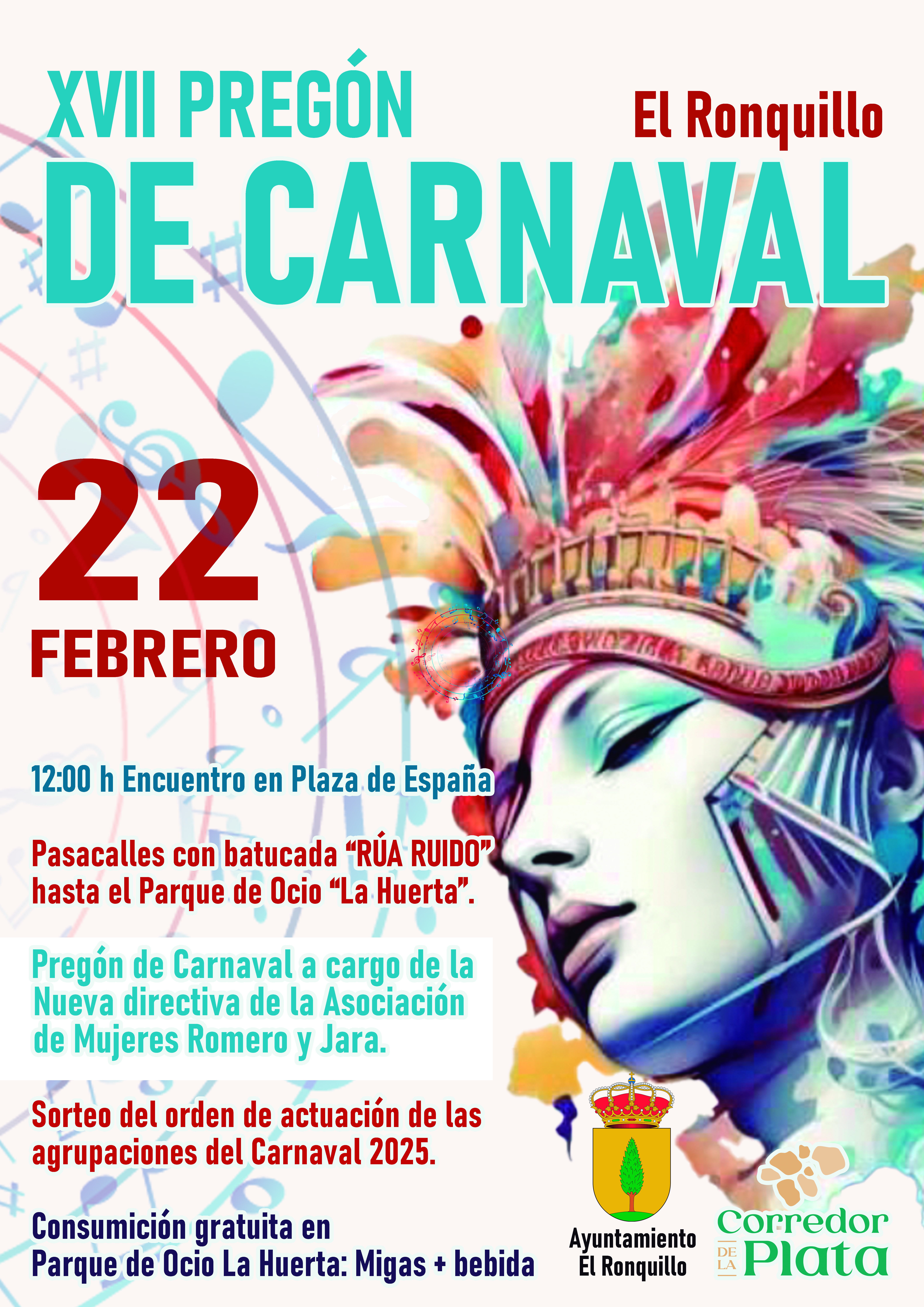 El sábado 22 de febrero El Ronquillo se colocará de nuevo el disfraz y saldrá a la calle a celebrar su XVII Pregón de Carnaval, este año a cargo de la "Nueva Directiva de la Asociación de Mujeres Romero y Jara".