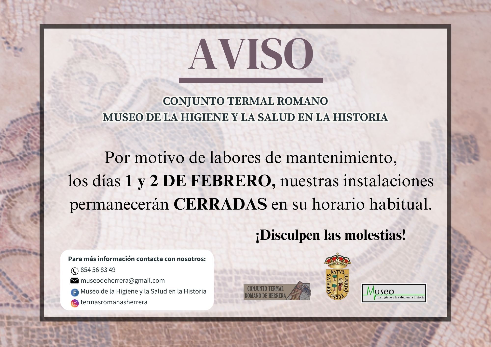 El próximo fin de semana las instalaciones de las Termas Romanas y el Museo de la Higiene y la Salud en la Historia permanecerán cerradas debido a labores de mantenimiento.