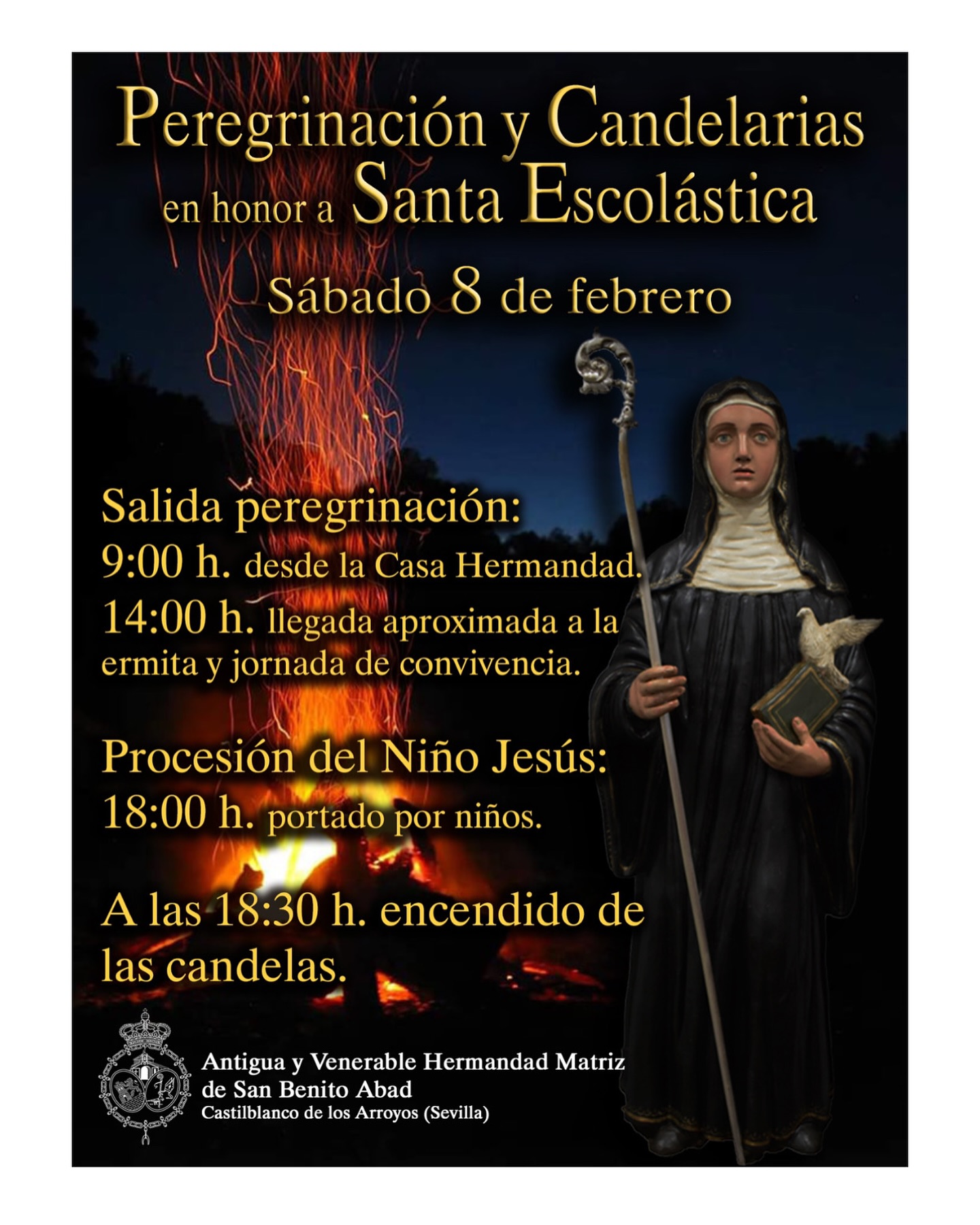 La Hermandad Matriz organiza una nueva jornada de convivencia vecinal a la que invita a todos los vecinos y vecinas a participar en la peregrinación que este sábado saldrá a las 9:00 horas desde la Casa Hermandad hacia la Ermita de San Benito, donde también, a las 18:00 se celebrará la procesión del Niño Jesús, portado por los más pequeños, para finalizar con el encendido de una Candelaria en honor a Santa Escolástica.