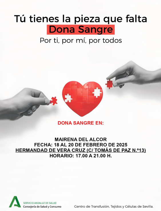 El Centro de Transfusión, Tejidos y Células de Sevilla organiza una nueva campaña de donación de sangre en la casa hermandad de la Vera Cruz (calle Tomás de Paz, 13) los días 18, 19 y 20 de febrero de 17 a 21 horas.