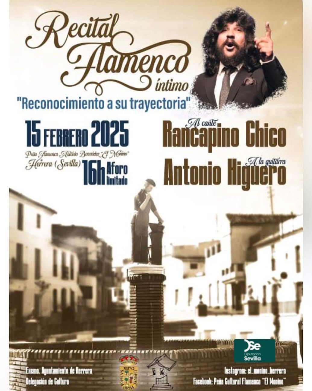 La concejalía de Cultura del Ayuntamiento de Herrera organiza el próximo sábado, 15 de febrero, un recital de flamenco íntimo en la Peña Flamenca "El Monino". Allí actuará Rancapino Chico, que volverá a visitar Herrera, donde ya participó en 2022 en la XXXIII Noche Flamenca "Pedro el de la Timotea".