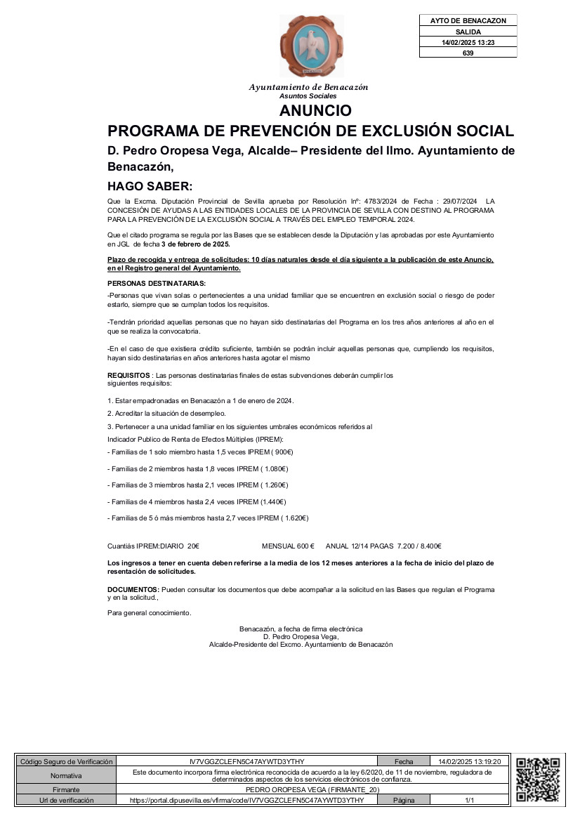 El Ayuntamiento de Benacazón informa del PROGRAMA PARA LA PREVENCIÓN DE LA EXCLUSIÓN SOCIAL A TRAVÉS DEL EMPLEO TEMPORAL 2024, cuyas Bases se establecen desde la Diputación y aprobadas por este Ayuntamiento.