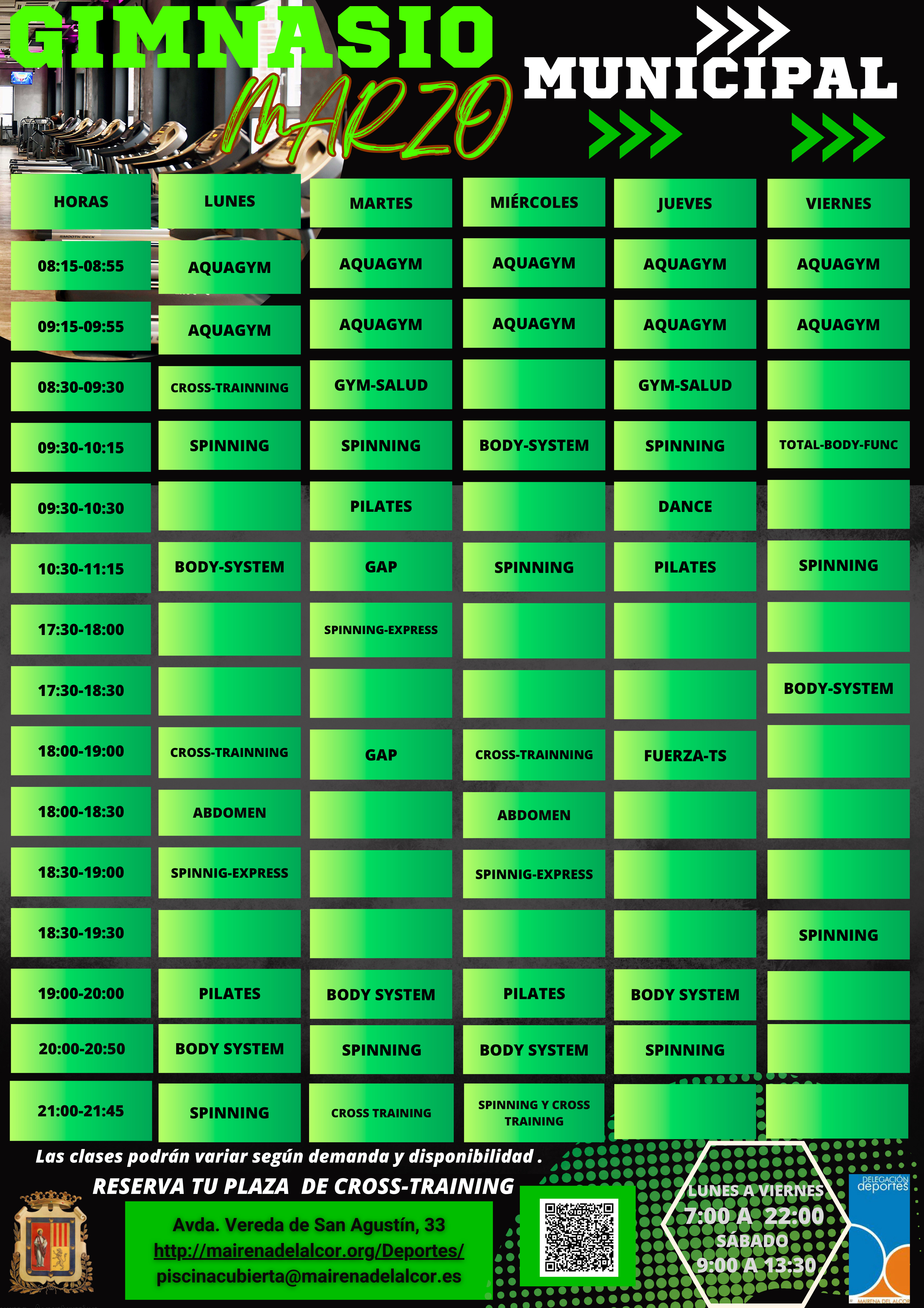 La Delegación de Deportes difunde las clases y horarios del gimnasio municipal para el mes de marzo de 2025.