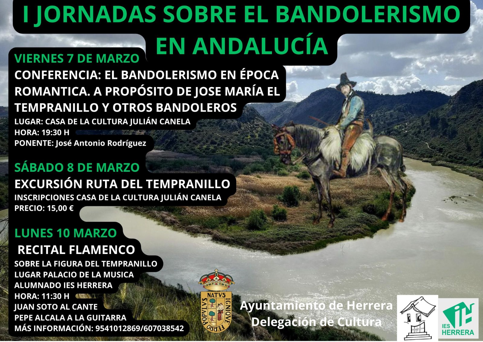 El primer fin de semana de marzo se celebrará en Herrera las primeras "Jornadas sobre bandolerismo en Andalucía". El ciclo se compone de una conferencia impartida por José Antonio Rodríguez, miembro de la Real Academia de Nobles Artes de Antequera, una excusión por la Ruta del Tempranillo y un recital flamenco sobre la figura del mencionado bandolero con Juan Soto al cante y Pepe Alcalá a la guitarra.
