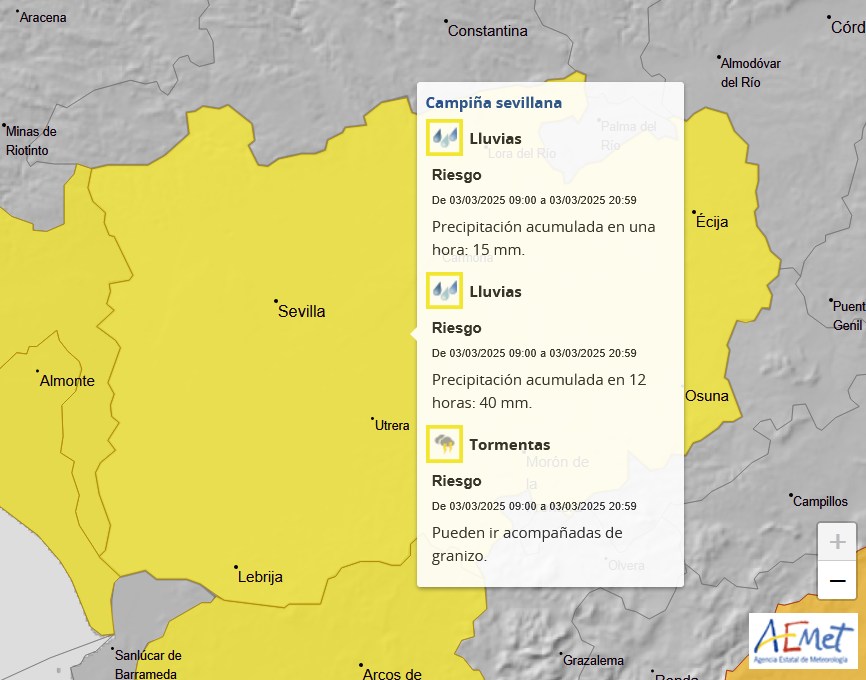 - Aviso amarillo por lluvias de 9 a 20.59 horas. Valor: 15 mm en 1 hora y 40 mm en 12 horas.