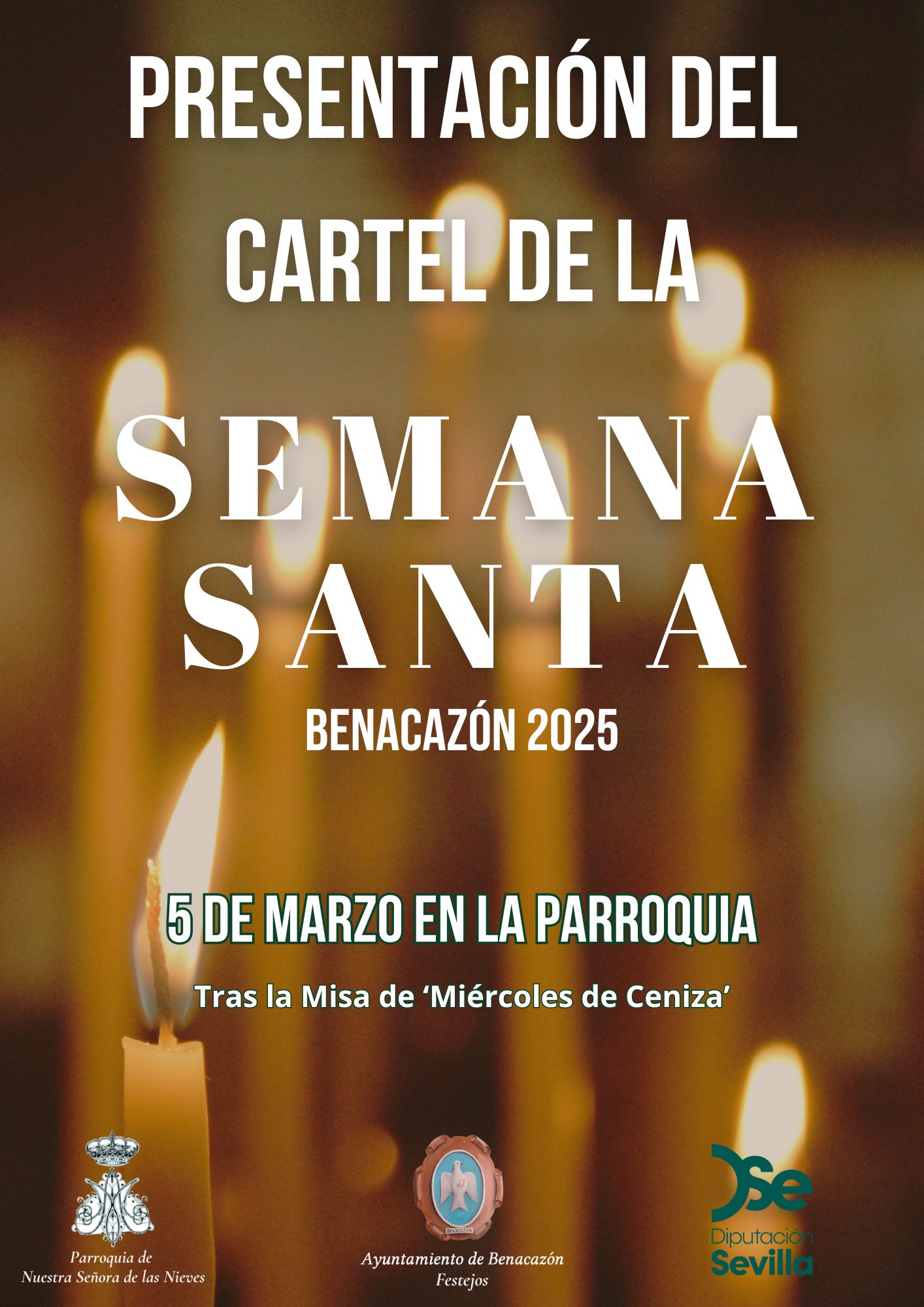 El Ayuntamiento de Benacazón informa que mañana 5 de Marzo, 'Miércoles de Ceniza' y una vez finalizada la misa de las 19:00 h. en la Iglesia Parroquial de Nuestra Señora de las Nieves, tendrá lugar la PRESENTACIÓN DEL CARTEL DE LA SEMANA SANTA DE BENACAZÓN 2025. Una obra pictórica realizada por el pintor y cartelista DAVID GÓMEZ LÓPEZ (natural de Mairena del Alcor) que, siguiendo la alternancia de carteles establecida entre las Hermandades de penitencia de nuestro pueblo, este año corresponde a la Hermandad de la Vera Cruz de Benacazón. El Cartel ha sido impreso por la Diputación de Sevilla a través de la Delegación municipal de Festejos. Su concejal, Diego Perejón, anima a tod@s l@s vecin@s de Benacazón a acudir a este acto en el que conoceremos la imagen que anunciará nuestra próxima Semana Santa.