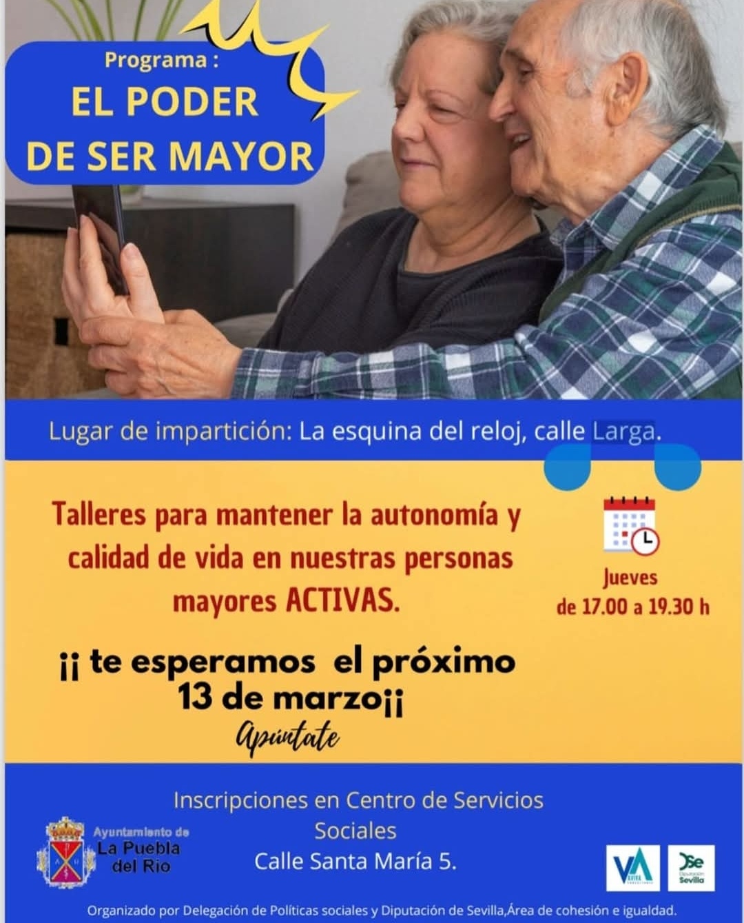 Por ello, gracias a la Diputación de Sevilla, el Ayuntamiento de La Puebla, a través de la Delegación de Políticas Sociales, pone en marcha el taller "El Poder de ser mayor", donde se van a realizar un buen número de actividades, enfocadas a mayores de 55 años, para mantener la autonomía y calidad de vida.