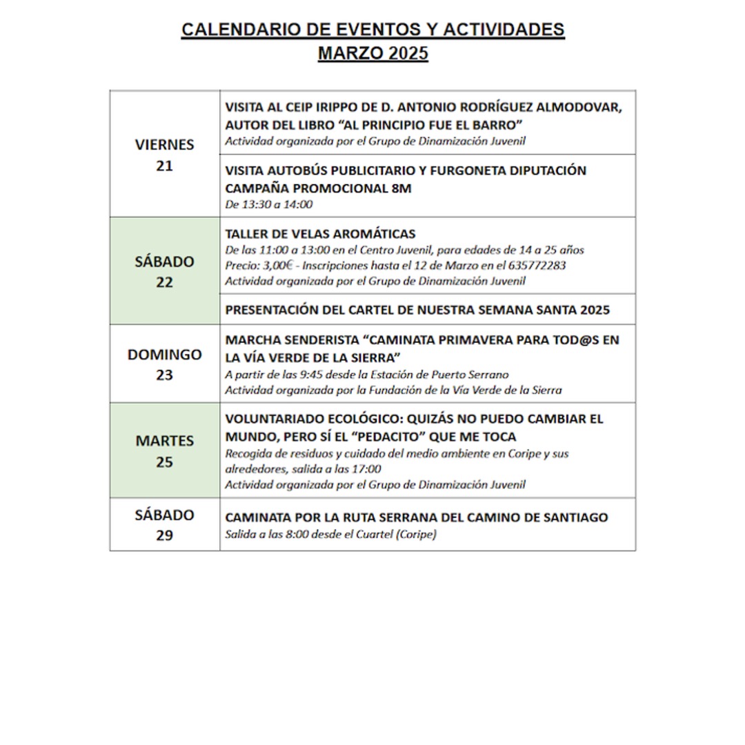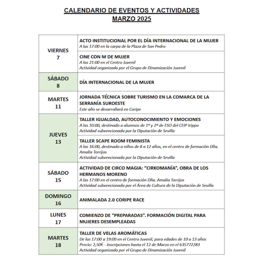 Imagen Imágenes Ubicación Categoría noticia Cultura Mostrar en el carrusel de la sección No Fecha Mié, 05/03/2025 - 07:30 Más información https://www.coripe.es/es/actualidad-y-agenda/actualidad/Calendario-de-actividad…