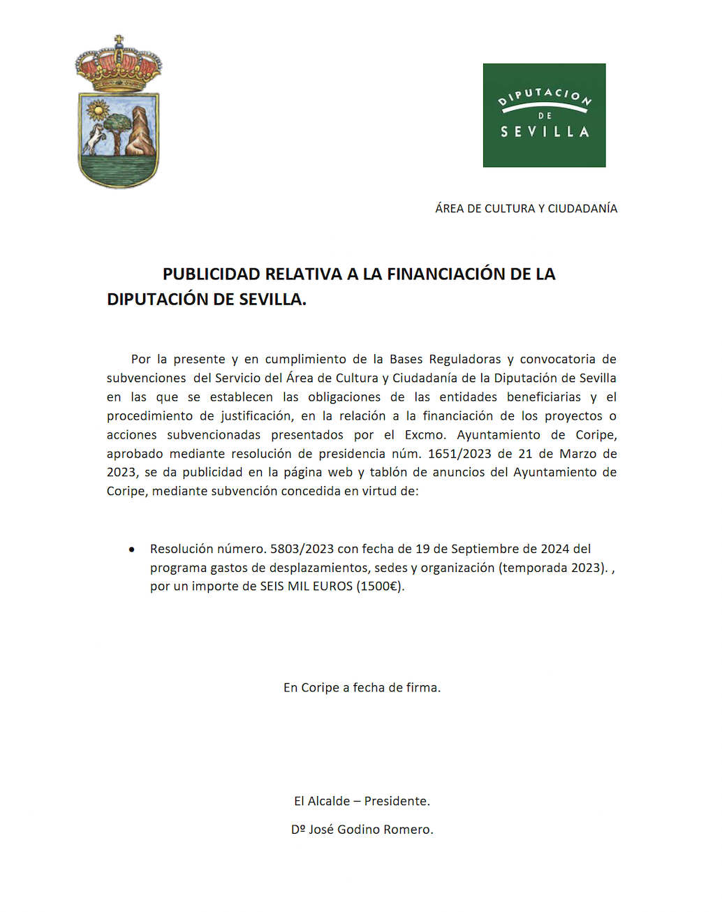 Por la presente y en cumplimiento de la Bases Reguladoras y convocatoria de subvenciones del Servicio del Área de Cultura y Ciudadanía de la Diputación de Sevilla en las que se establecen las obligaciones de las entidades beneficiarias y el procedimiento de justificación, en la relación a la financiación de los proyectos o acciones subvencionadas presentados por el Excmo. Ayuntamiento de Coripe, aprobado mediante resolución de presidencia núm. 1651/2023 de 21 de Marzo de 2023, se da publicidad en la página web y tablón de anuncios del Ayuntamiento de Coripe, mediante subvención concedida en virtud de: