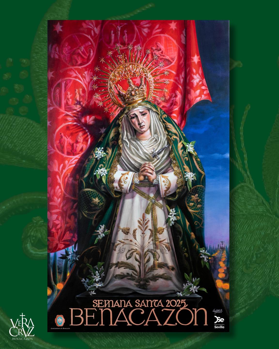 Una obra pictórica realizada por el artista DAVID GÓMEZ LÓPEZ (natural de Mairena del Alcor) que, siguiendo la alternancia de carteles establecida entre las Hermandades de penitencia de nuestro pueblo, este año corresponde a la Hermandad Vera Cruz Benacazón.