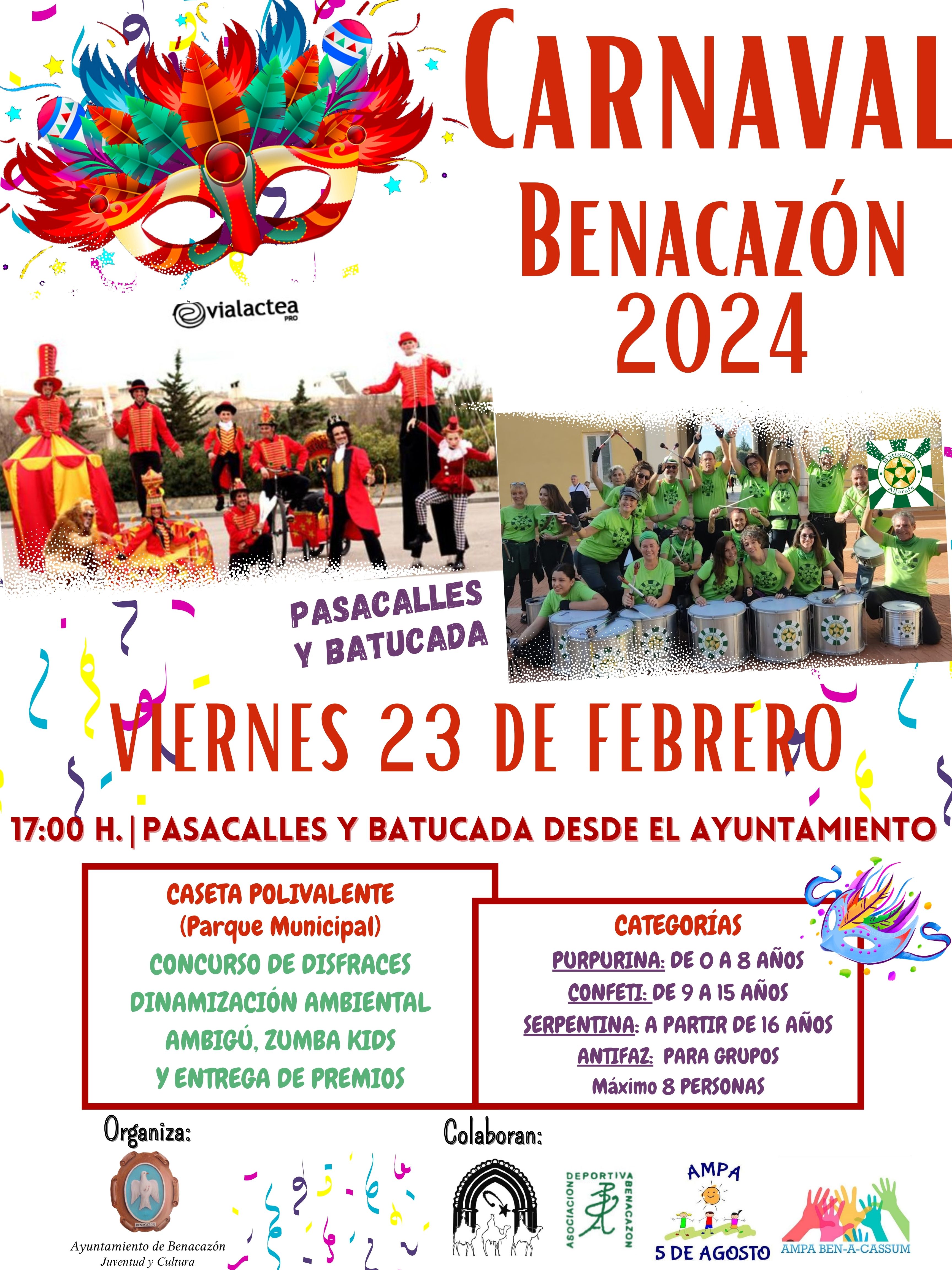 A las 17:00 horas comenzará el Pasacalles, de la compañía Vía Láctea Producciones, y el grupo de BATUCADA ALJARAFE, desde la Plaza Blas Infante por el recorrido oficial hasta finalizar en la Caseta Polivalente del Parque Municipal. Donde continuará la Fiesta de Carnaval con la actuación de ZUMBA KIDS de Paqui León (Asociación Deportiva Benacazón) y el Concurso de Disfraces de las distintas categorías, mientras disfrutamos del AMBIGÚ a beneficio de la Cabalgata de Reyes Magos.
