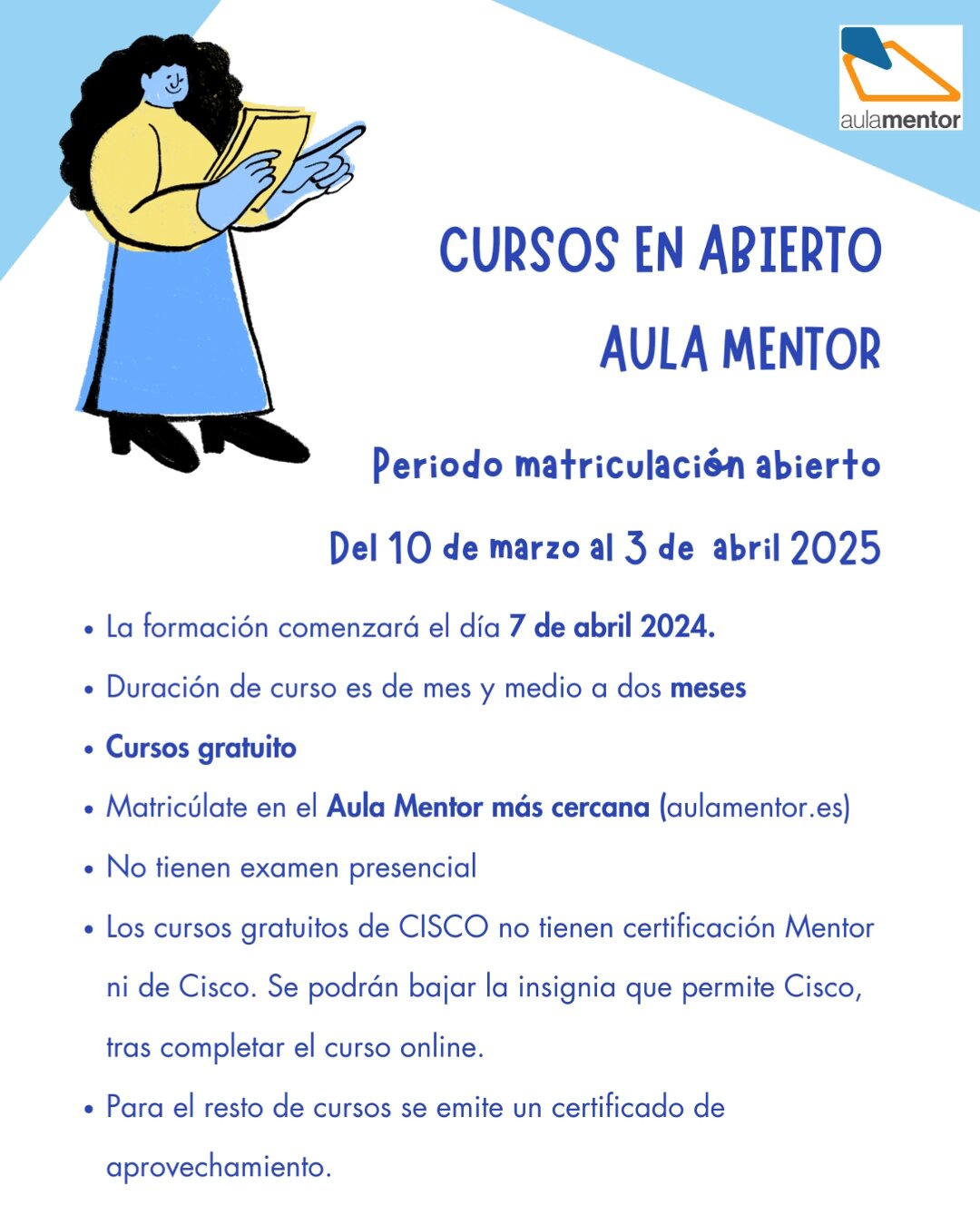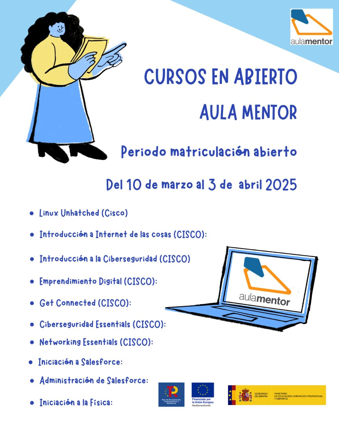 El Ayuntamiento de Mairena del Alcor, a través de la Delegación de Formación, difunde la nueva convocatoria de los cursos gratuitos que oferta Aula Mentor. El plazo de matriculación ya está abierto y termina el día 3 de abril.