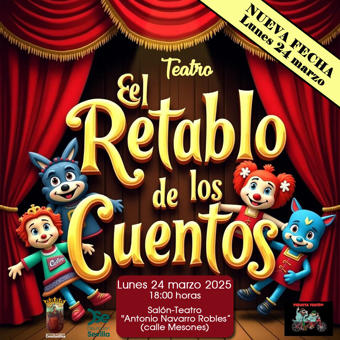 El Ayuntamiento de Constantina, a través subvención del Área de Cultura y Ciudadanía de la Diputación de Sevilla, te trae la obra de teatro infantil-familiar de títeres "El retablo de los cuentos" a cargo de la Compañía Pirueta Teatro.