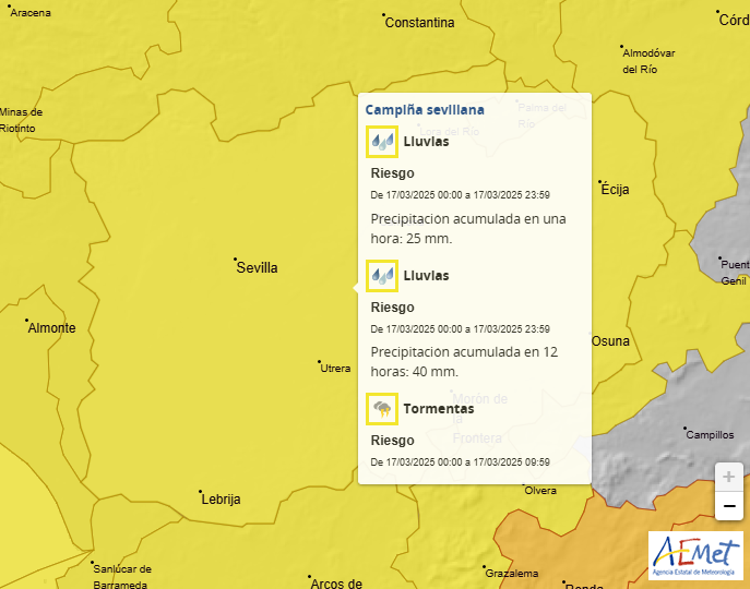 - Aviso amarillo por lluvias desde las 9 del 17 de marzo a las 5:59 horas del 18 de marzo. Valor: 25 mm en 1 hora