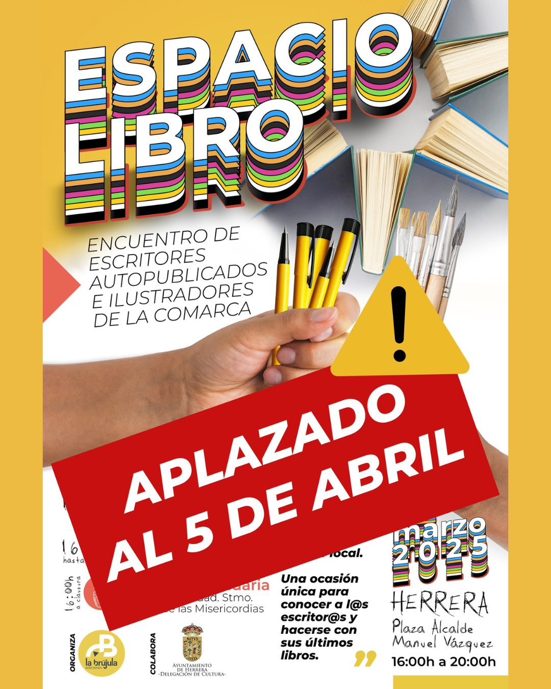 La Brújula Ediciones, organizadora de "Espacio Libro", ha aplazado el encuentro de autores e ilustradores que se iba a celebrar el próximo sábado en la Plaza Alcalde Manuel Vázquez. La nueva fecha propuesta es el sábado, 5 de abril.