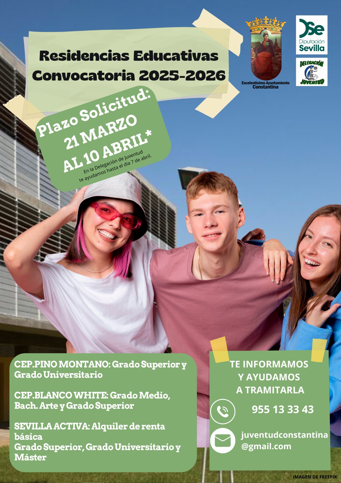 El Excmo. Ayuntamiento de Constantina, a través de su Delegación de Juventud informa de que la Diputación Provincial de Sevilla ha abierto el plazo para la solicitud de las plazas en Residencias Educativas para el curso escolar 2025/2026. Si eres estudiante y el año que viene vas a cursar estudios en Sevilla puedes optar a una plaza en una de las siguientes: