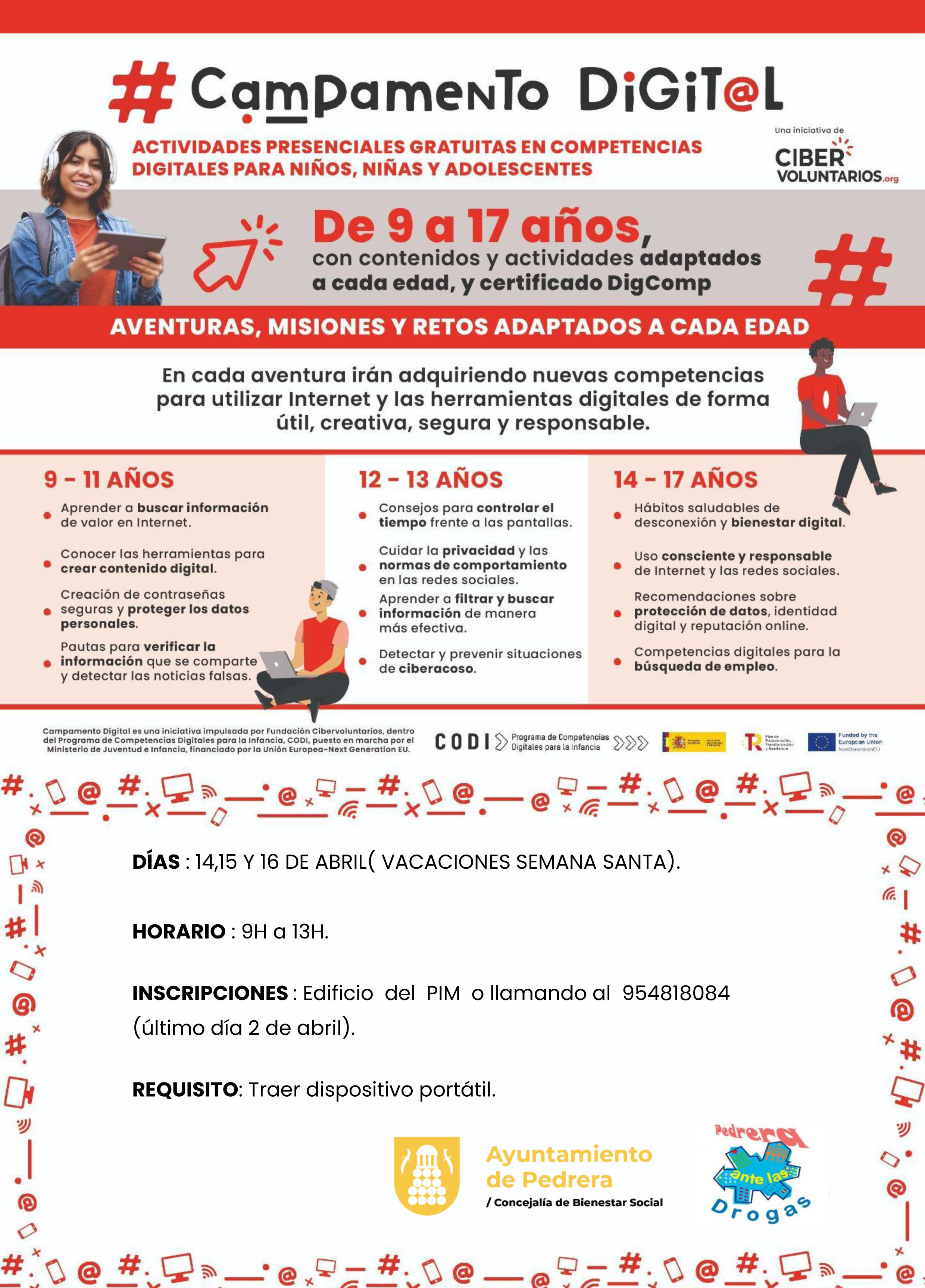Campamento digital se trata de un programa gratuito que ofrece actividades extraescolares centradas en competencias digitales, adaptadas según cada grupo de edad, y con formadores especializados. Los participantes aprenderán a navegar de forma segura, cuidar su huella digital, prevenir el ciberacoso y realizar un uso equilibrado y saludable de las pantallas, entre otras habilidades. Además, el grupo de mayor edad también adquirirá competencias digitales específicas para la búsqueda de empleo.