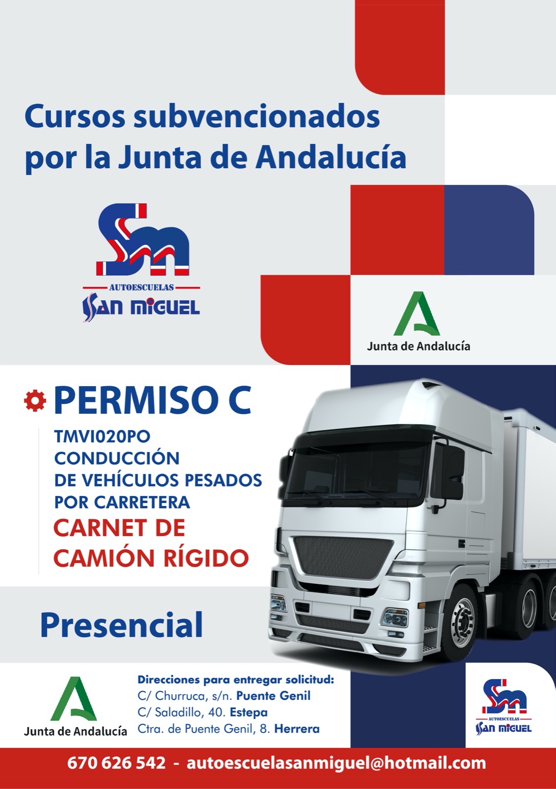 La Junta de Andalucía subvenciona diferentes cursos presenciales. Es el caso del Permiso C (Conducción de vehículos pesados por carretera).