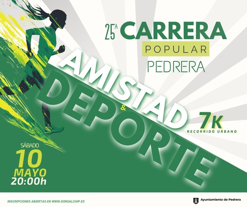 El próximo sábado 10 de mayo, Pedrera acogerá la edición número 25 de la Carrera Popular del Deporte y la Amistad, una cita ya clásica en el calendario deportivo local que volverá a reunir a atletas de todas las edades y lugares con el objetivo de disfrutar de una jornada marcada por los valores del deporte: afán de superación, compañerismo y sana competitividad.