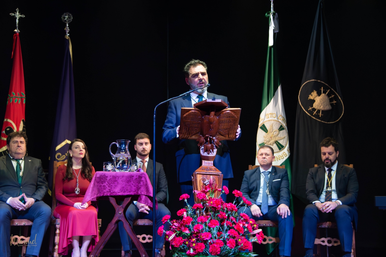 Uno de los momentos más intensos fue su exaltación al Cristo de la Sangre, titular de la Hermandad organizadora del acto. "Gracias a aquella carreta que quedó clavada, hoy todo un pueblo te venera", proclamó, evocando la leyenda que envuelve la llegada de esta imagen a Pedrera.