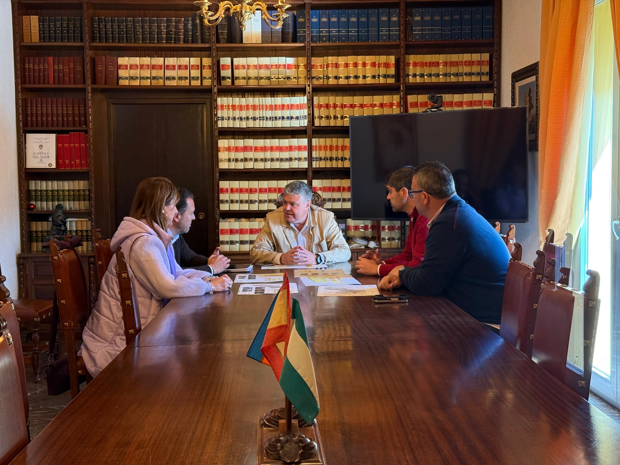 El arquitecto local, José Manuel González, junto al alcalde, Juanma López, y miembros del Equipo de Gobierno, han revisado las primeras propuestas planteadas.