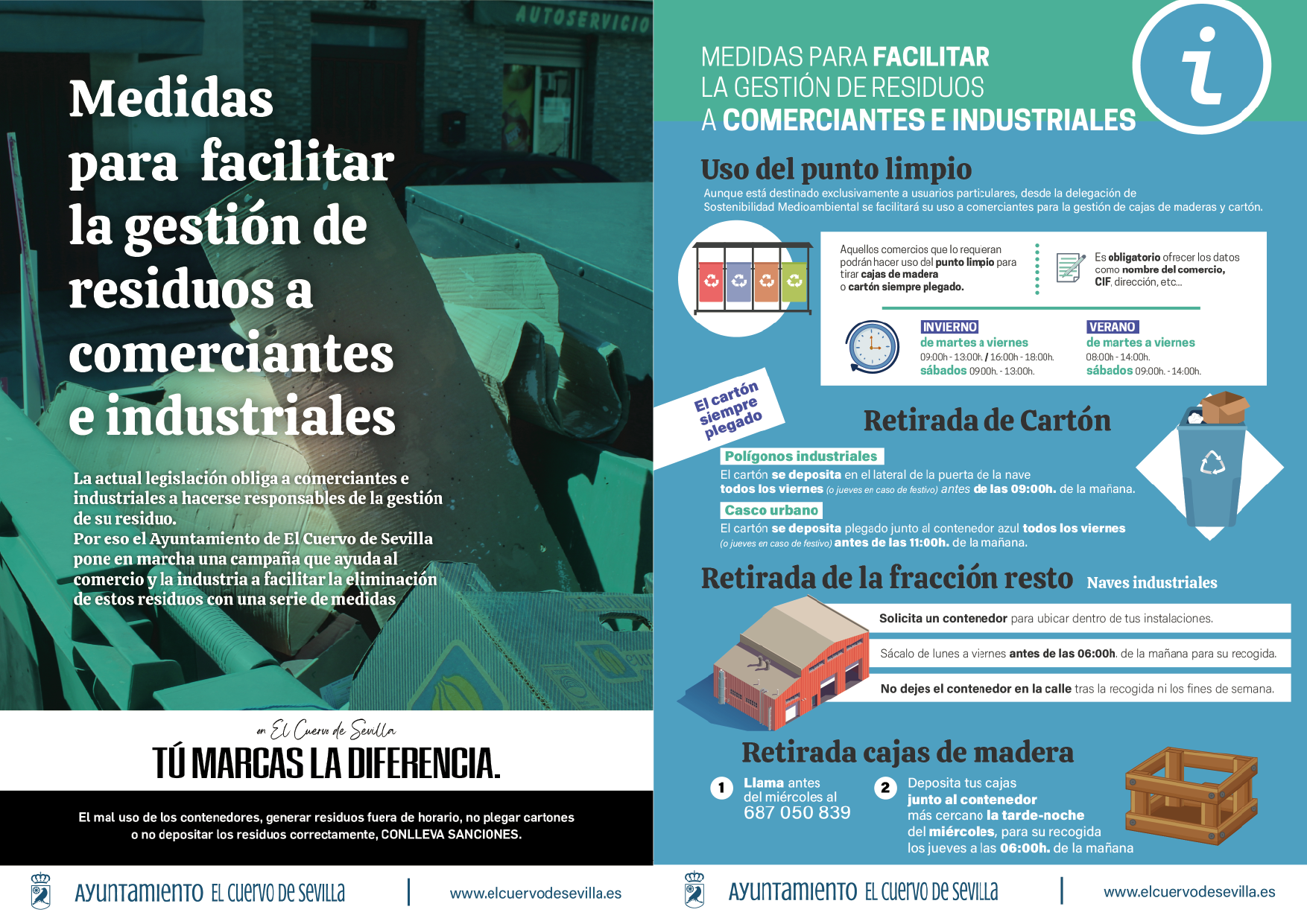 1 de abril de 2025.- Con motivo de la entrada en este mes de abril de la nueva Ley de Economía Circular de Gestión de Residuos en los Municipios, desde la delegación de Sostenibilidad Medioambiental del Ayuntamiento de El Cuervo de Sevilla se ha puesto en marcha una campaña para acercar y facilitar a los comerciantes e industriales de la localidad las medidas impulsadas por este organismo para facilitar la gestión de dichos residuos de manera más fácil.