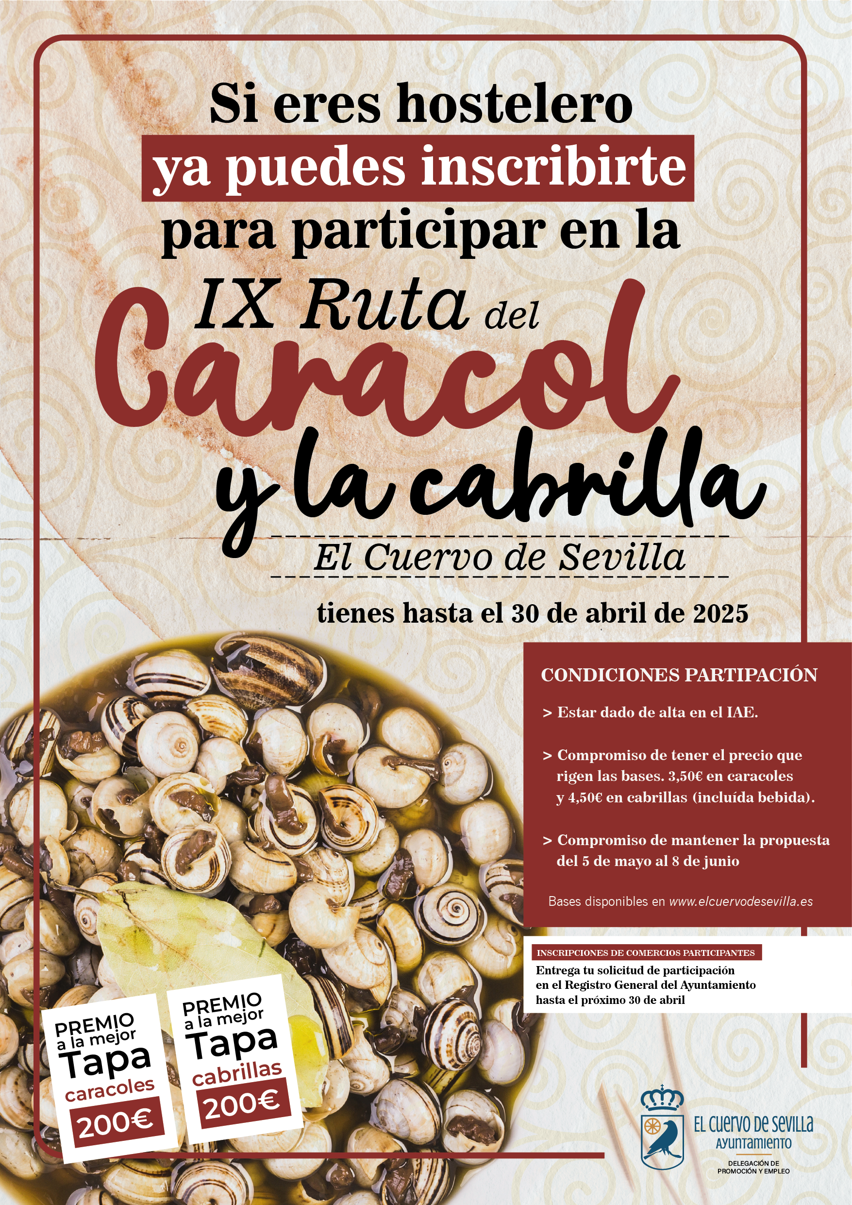 - Podrán participar todos aquellos establecimientos de El Cuervo que se encuentren dados de alta en el Impuesto de Actividades Económicas y cumplan con todos los requisitos establecidos en la normativa vigente en materia de sanidad, higiene, limpieza y seguridad durante la celebración de la IX Ruta del Caracol y las Cabrillas.
