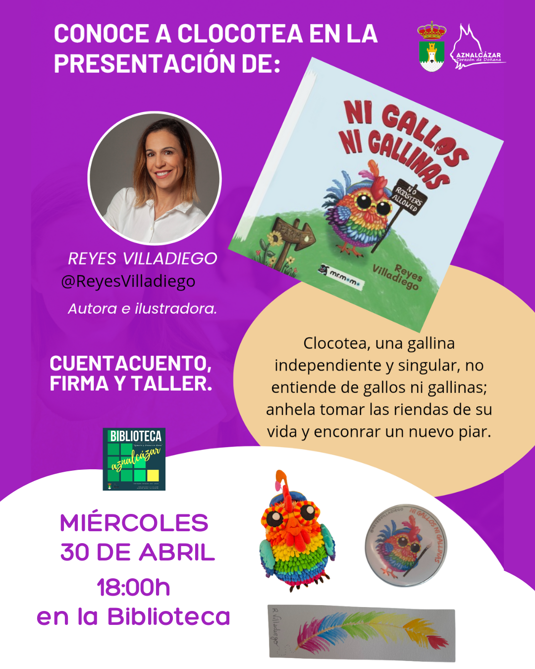 El miércoles de la próxima semana, 30 de abril, a las 18.00h celebramos el Día del Libro con la presentación de 'Ni gallos, ni gallinas', destinada a niños y niñas a partir de 4 años. Su autora, Reyes Villadiego nos presentará a la protagonista, Clocotea, una gallina independiente que quiere tomar las riendas de su propia vida, sin importarle romper con los moldes establecidos. ¡Además, haremos un taller con plumas!