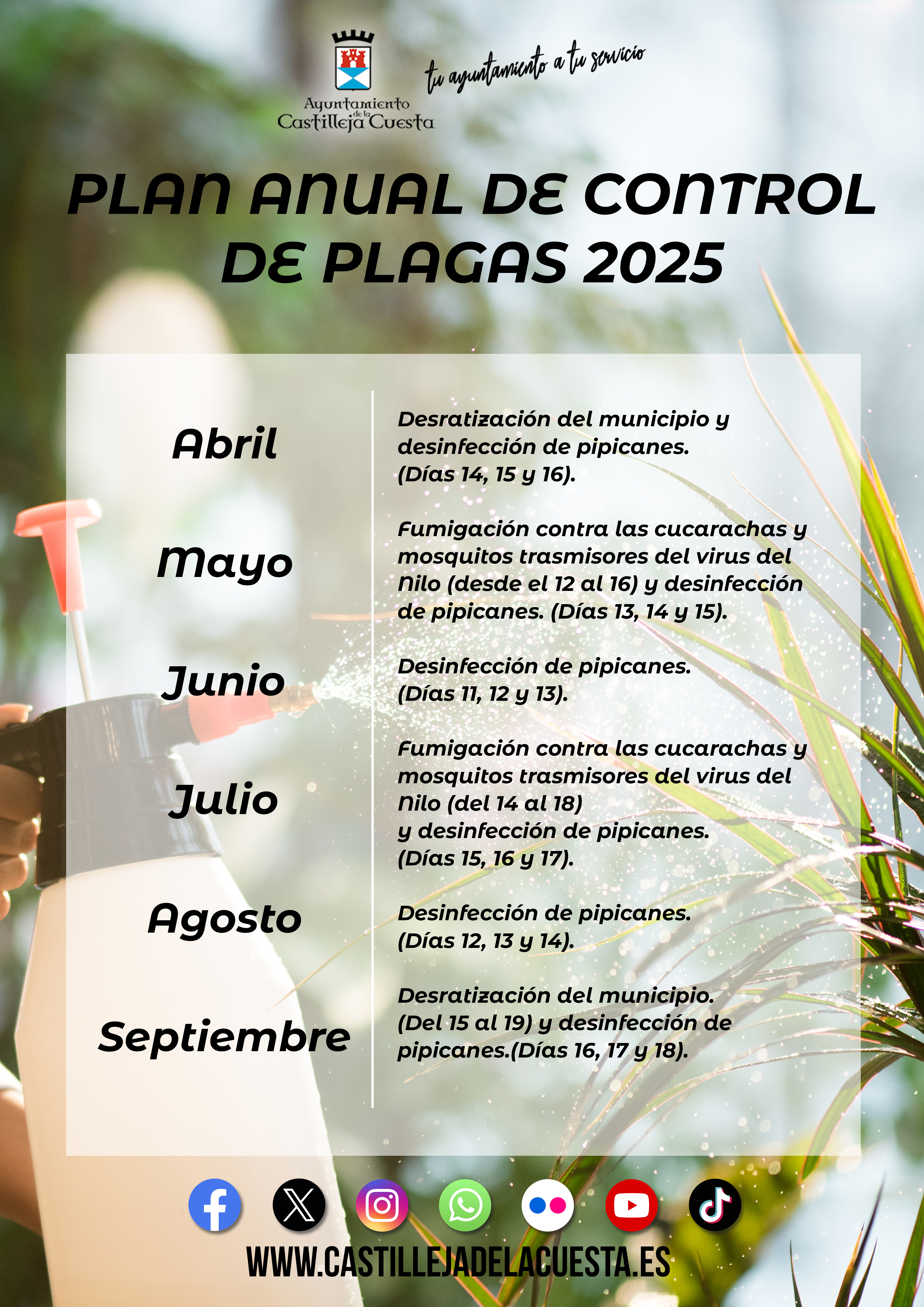 El Ayuntamiento continúa con las distintas campañas de desinsectación iniciadas en enero, y que se mantienen durante todo el año, con el fin de evitar la molesta aparición de insectos. Se trata de actuaciones periódicas de seguimiento y vigilancia de las campañas anti plagas por calles y plazas de Castilleja de la Cuesta, así como a petición de vecinos y vecinas.