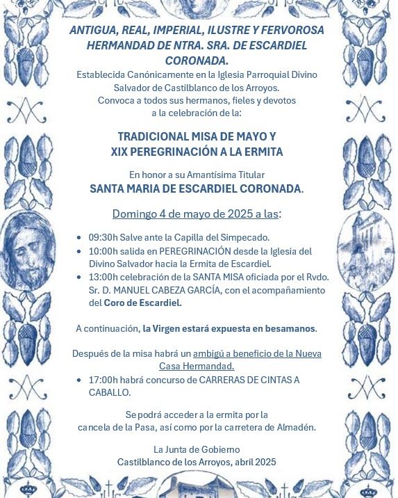 La Hermandad de Ntra. Sra. de Escardiel Coronada informa de que este domingo, 4 de mayo tendrá lugar la tradicional Misa del mes de Mayo, con la celebración de la XIX Peregrinación a la Ermita, a la que se invita a unirse a todos sus hermanos, fieles y devotos.