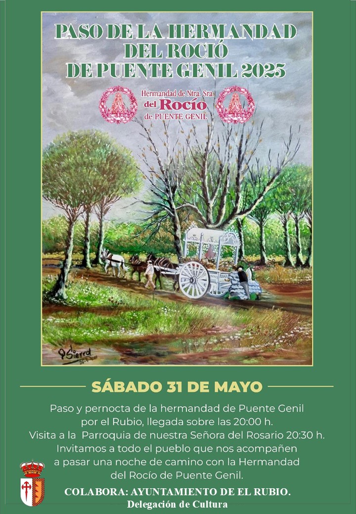 con motivo de su anual Peregrinación de Pentecostés hacia el Santuario del Rocío, les invita a acompañar al simpecado de nuestra Hermandad , a su paso por el pueblo de El Rubio.