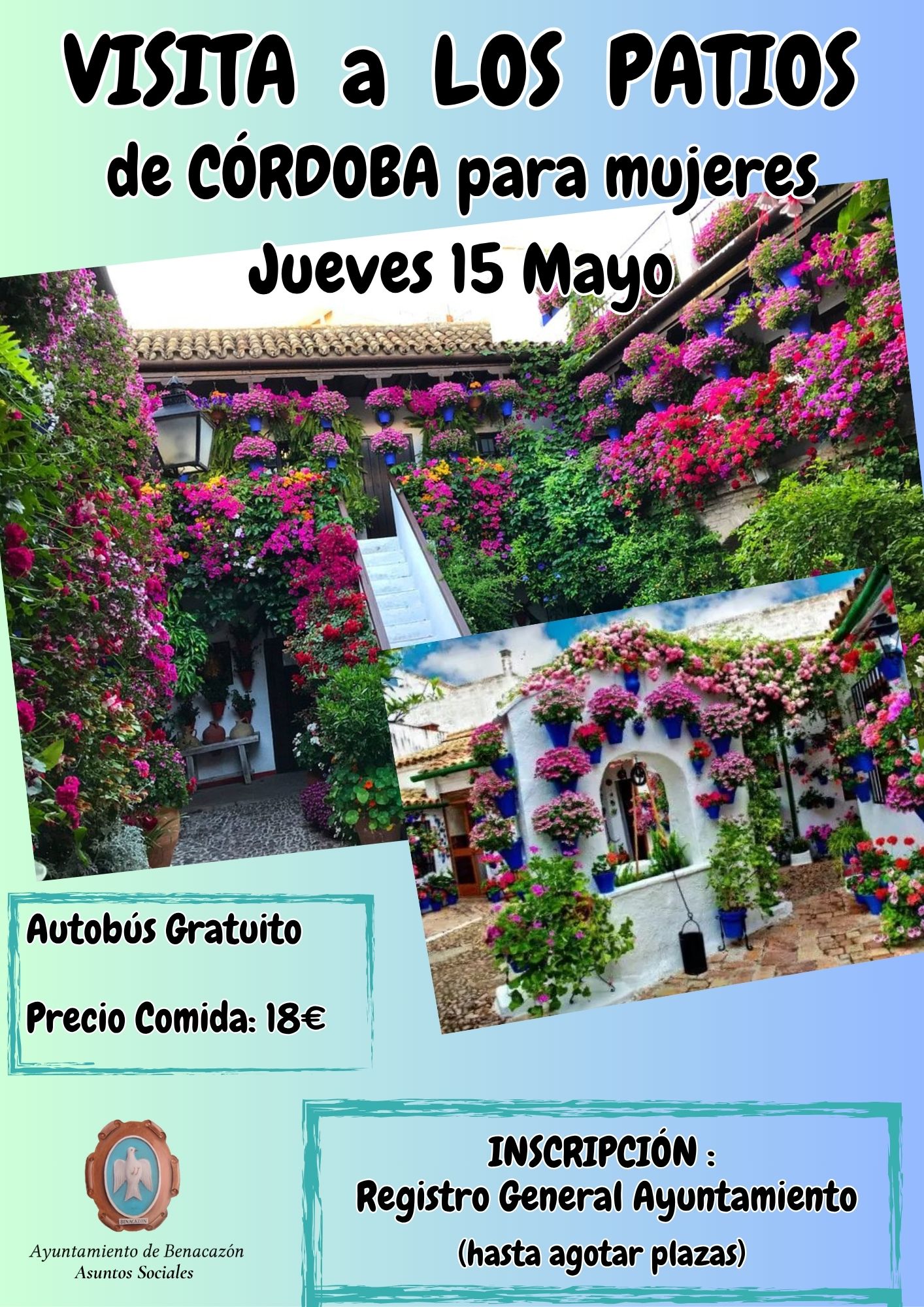 El Ayuntamiento de Benacazón informa de la VISITA a los PATIOS DE CÓRDOBA, que tendrá lugar el próximo jueves 15 de Mayo, destinada a mujeres de nuestro municipio.