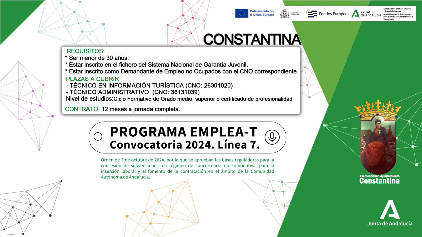 Es un programa cofinanciado por la Unión Europea, el Ministerio de Trabajo y Economía Social, la Consejería de Empleo, Empresa y Trabajo Autónomo y el Ayuntamiento de Constantina y consiste en la contratación en formación para la adquisición de prácticas profesionales en la administración local.