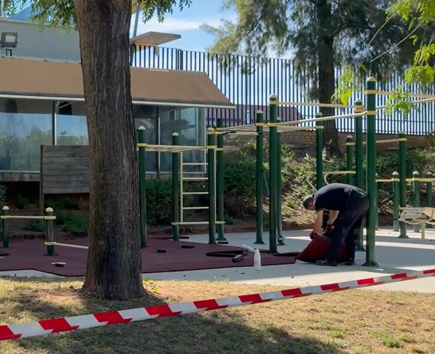El concejal de Deportes, Javier Rodríguez, describe el nuevo circuito de calistenia que se está instalando en el parque municipal Tierno Galván. Esta nueva instalación completa el complejo deportivo formado por el gimnasio, las piscinas y el polideportivo con esta modalidad deportiva tan demandada actualmente.