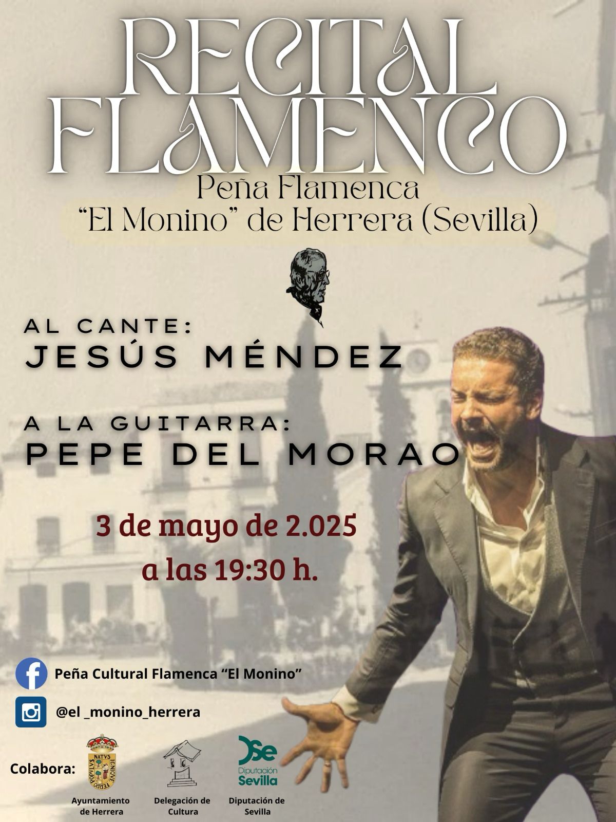 La concejalía de Cultura del Ayuntamiento de Herrera, en colaboración con la Diputación de Sevilla, organiza el próximo sábado, 3 de mayo, un recital de en la Peña Flamenca "El Monino". Al cante estará Jesús Méndez y a la guitarra Pepe del Morao, ambos profesionales de reconocido prestigio.