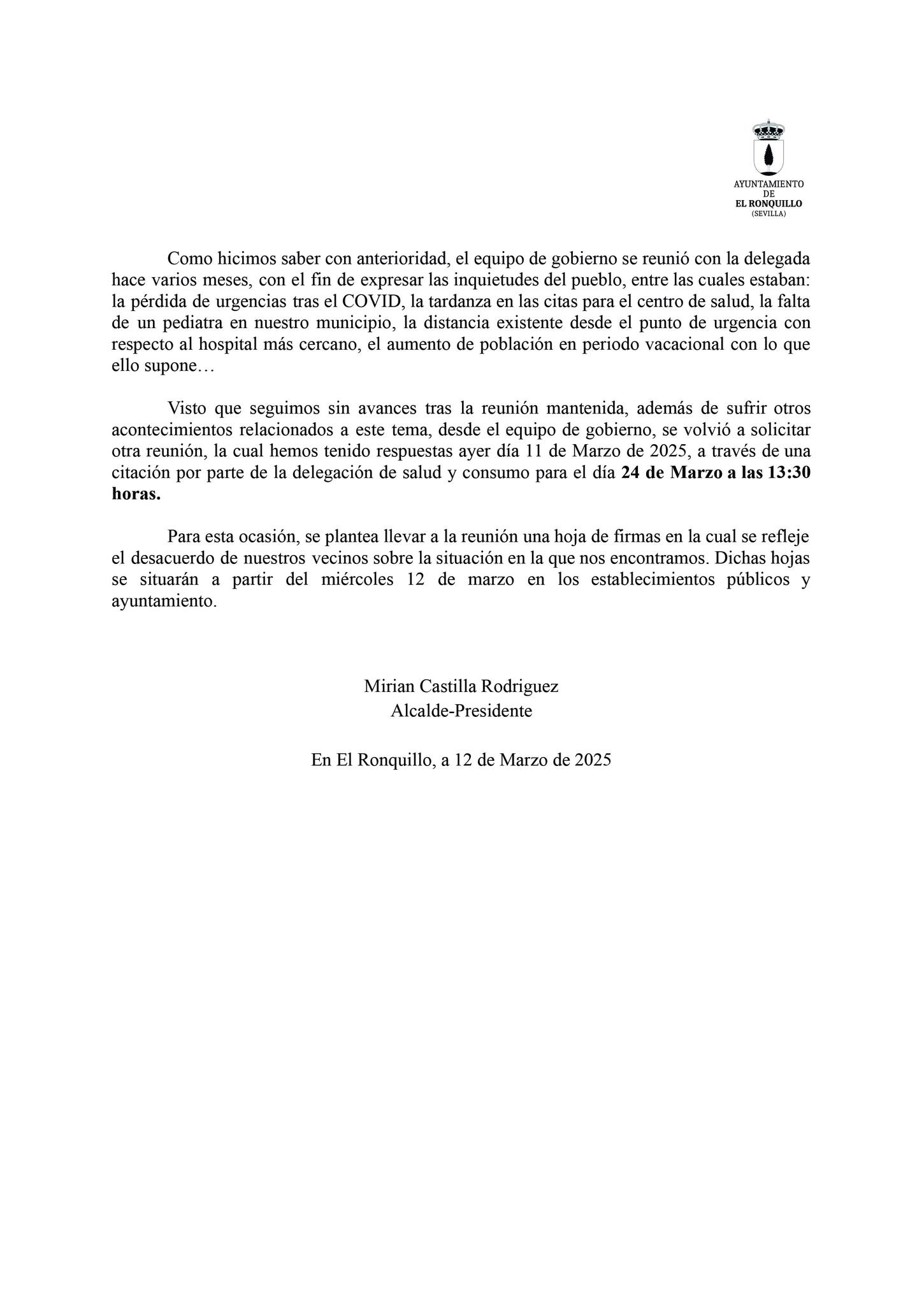 Visto que seguimos sin avances tras la reunión mantenida, además de sufrir otros acontecimientos relacionados a este tema, desde el equipo de gobierno se volvió a solicitar otra reunión, teniendo respuesta ayer, día 11 de Marzo de 2025, a través de una