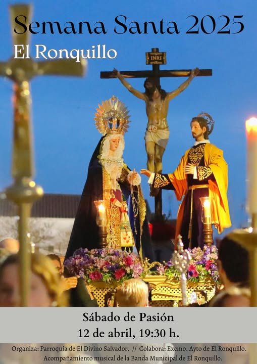 Este sábado, 12 de abril, Sábado de Pasión, las sagradas imágenes de Ntra. Sra. de los Dolores, Cristo del Amor y San Juan Evangelista, procesionarán por las calles de nuestro pueblo a partir de las 19:30 h., acompañados por la Banda de Música de El Ronquillo.