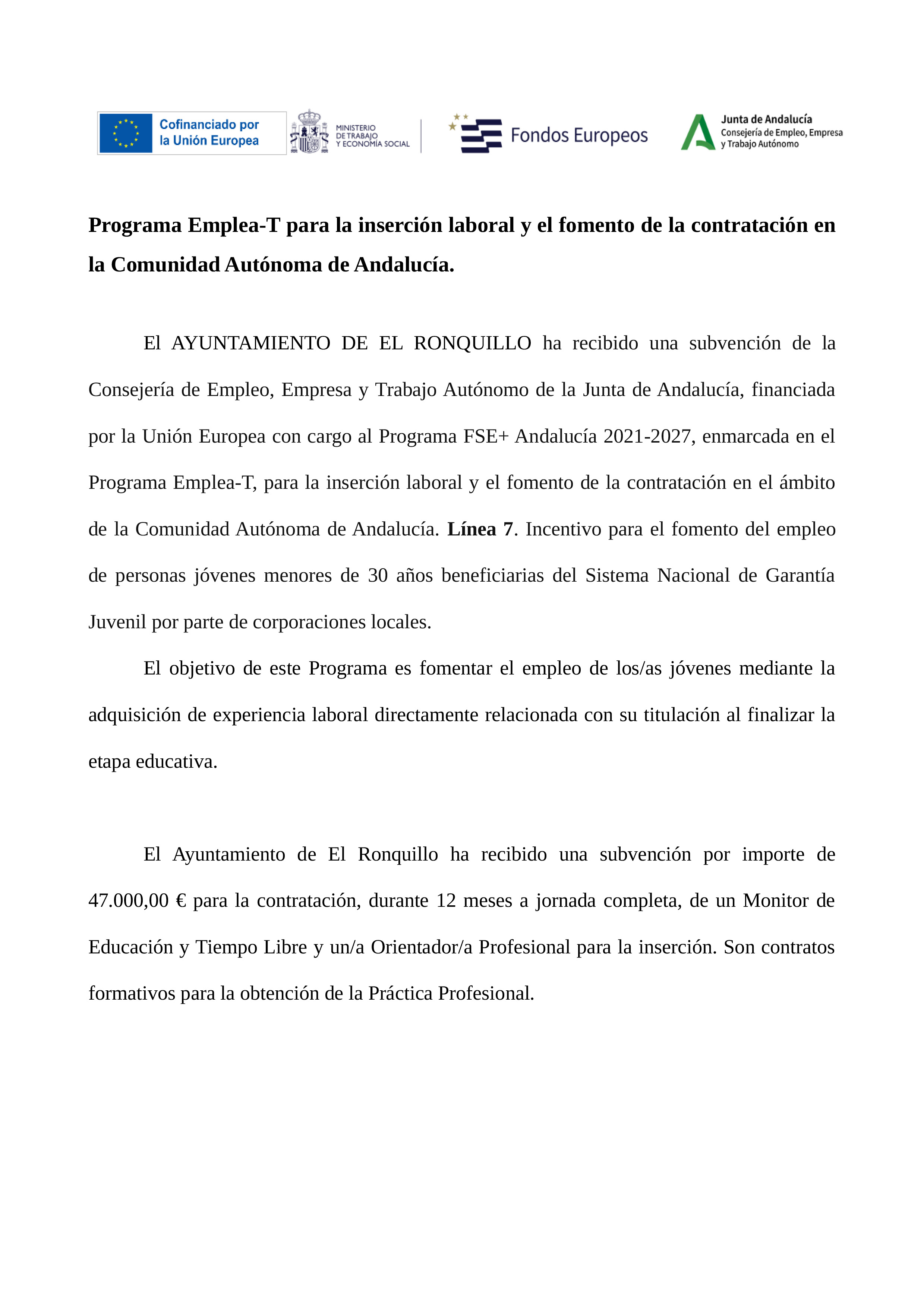 El AYUNTAMIENTO DE EL RONQUILLO ha recibido una subvención de la Consejería de Empleo, Empresa y Trabajo Autónomo de la Junta de Andalucía, financiada por la Unión Europea con cargo al Programa FSE Andalucía 2021-2027, enmarcada en el Programa Emplea-T, para la inserción laboral y el fomento de la contratación en el ámbito de la Comunidad Autónoma de Andalucía. Línea 7. Incentivo para el fomento del empleo de personas jóvenes menores de 30 años beneficiarias del Sistema Nacional de Garantía Juvenil por parte de corporaciones locales.