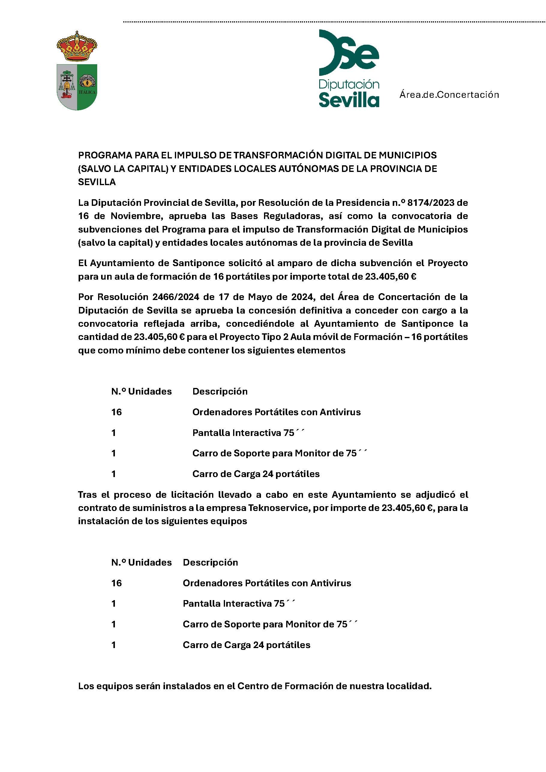 Por Resolución 2466/2024 de 17 de Mayo de 2024, del Área de Concertación de la Diputación de Sevilla se aprueba la concesión definitiva a conceder con cargo a la convocatoria reflejada arriba, concediéndole al Ayuntamiento de Santiponce la cantidad de 23.405,60 € para el Proyecto Tipo 2 Aula móvil de Formación – 16 portátiles que como mínimo debe contener los siguientes elementos
