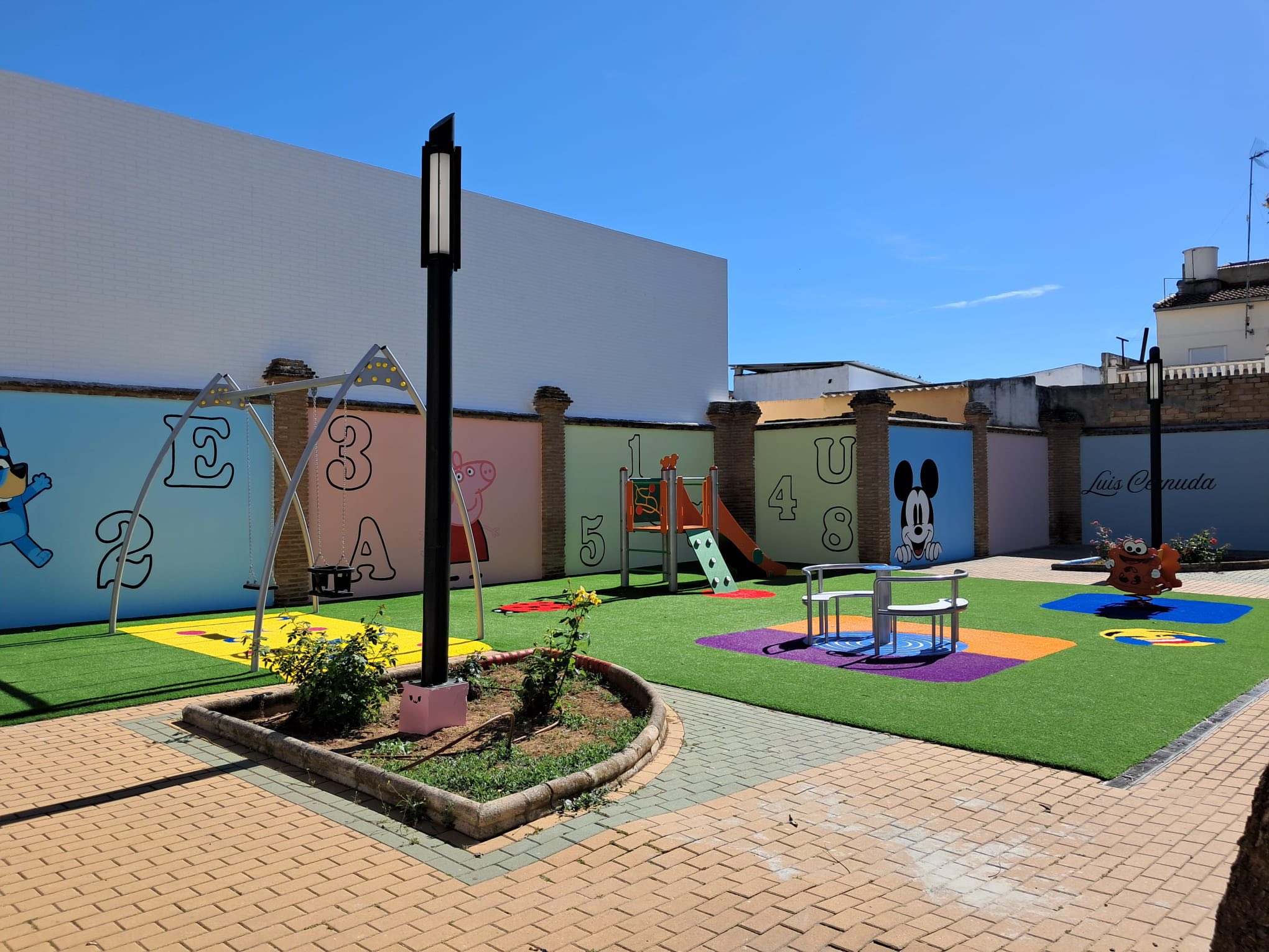 Además de la instalación de nuevos elementos de diversión, se han ilustrado las paredes con dibujos de animación populares y un fragmento de "Niño tras un cristal", poema del poeta sevillano donde se percibe la inocencia de la niñez.