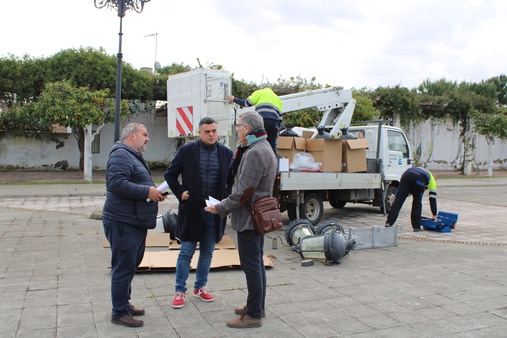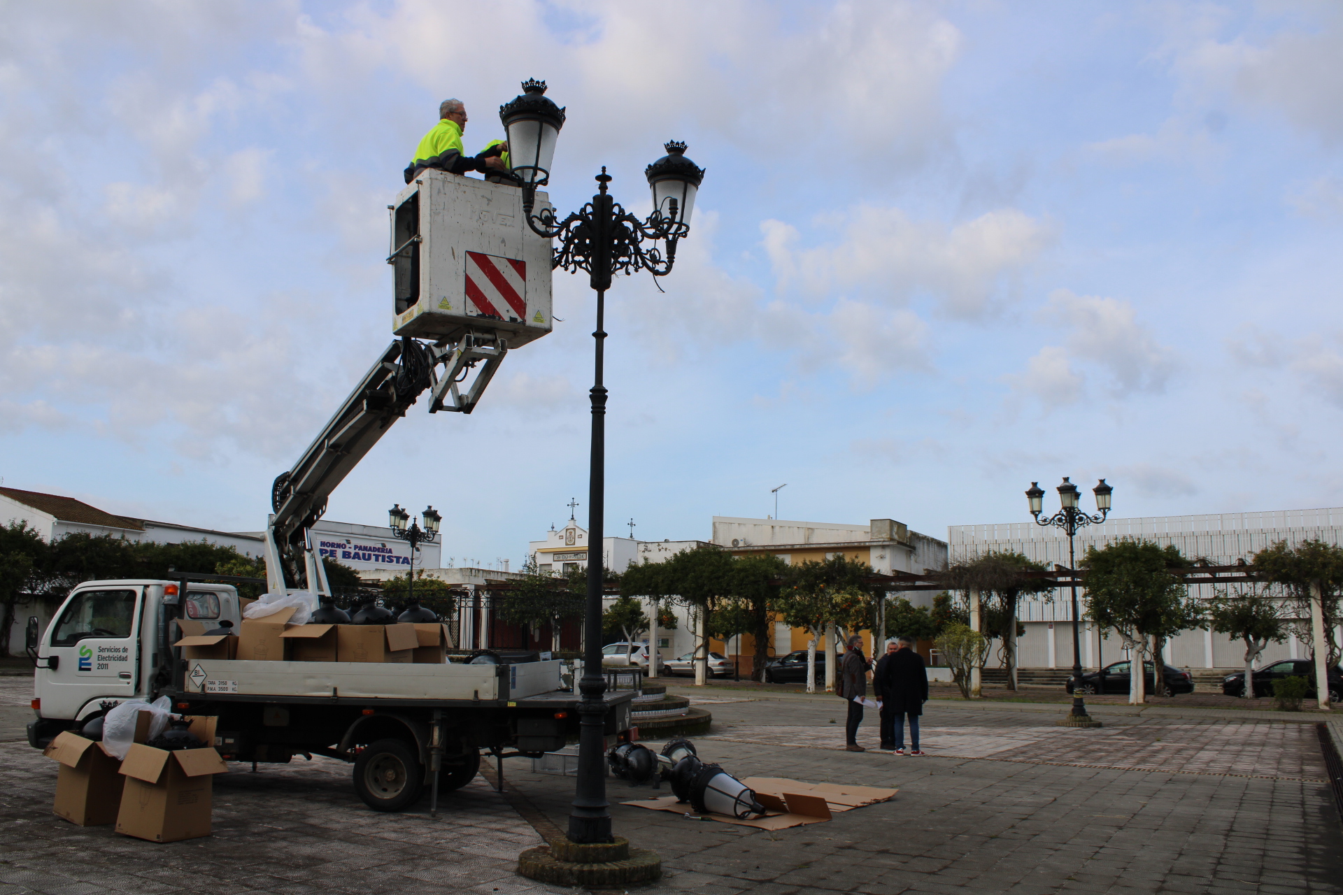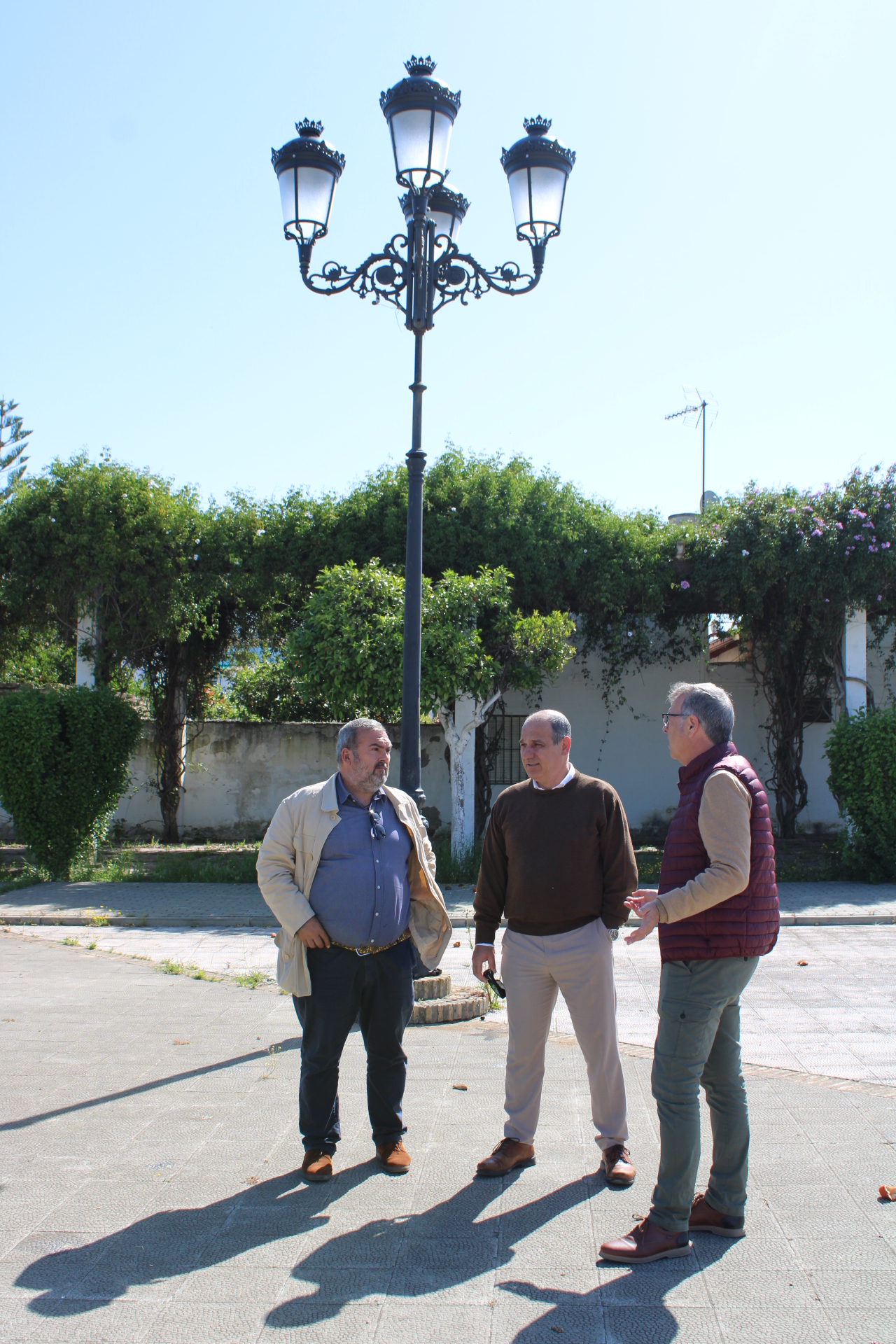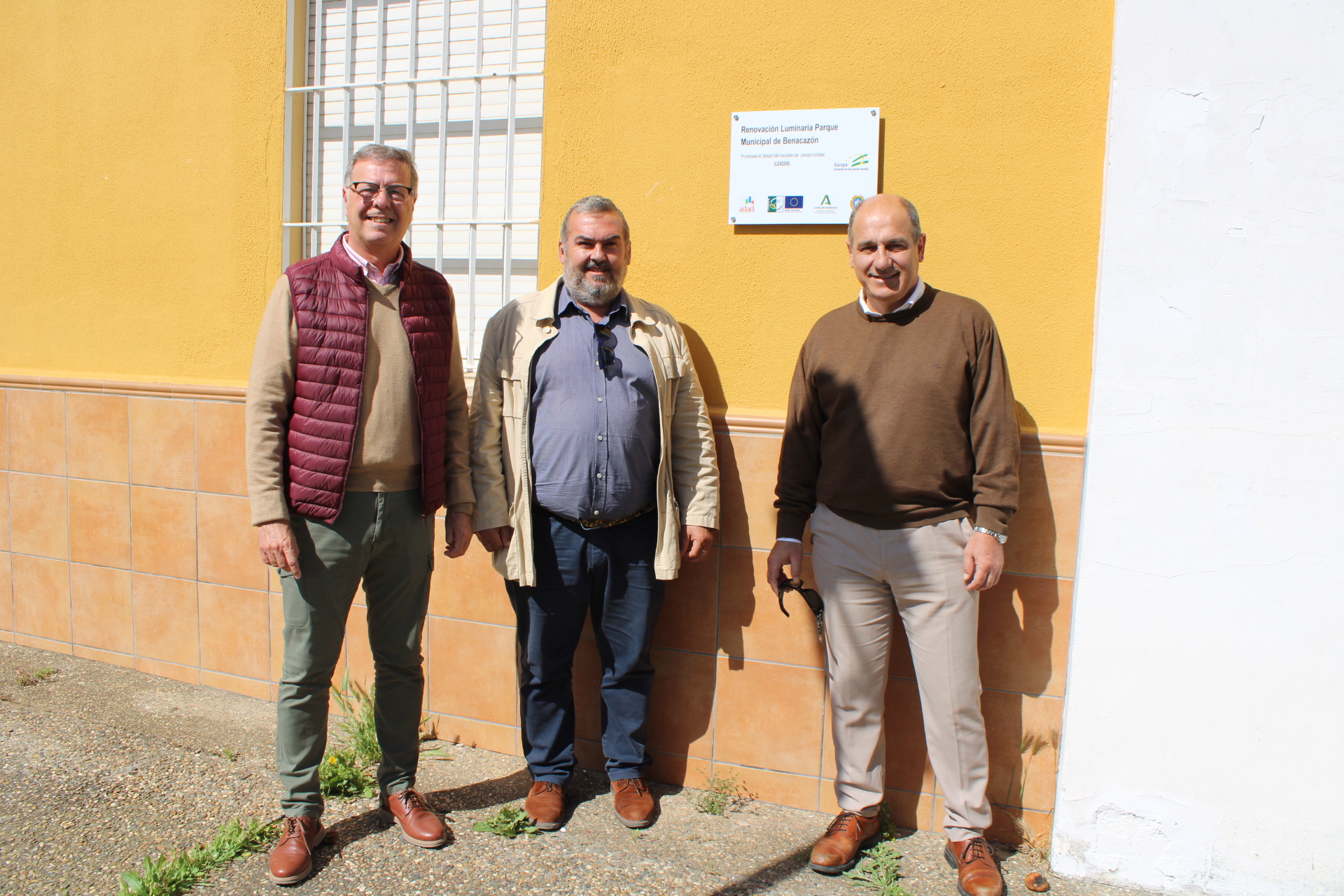 El Gerente de GDR Aljarafe-Doñana (ADAD), Florencio Valero, ha supervisado hoy jueves 24 de abril la instalación de la nueva luminaria en Benacazón, junto al Concejal de Urbanismo y Desarrollo Local Antonio Bautista y el técnico del área José Valero.