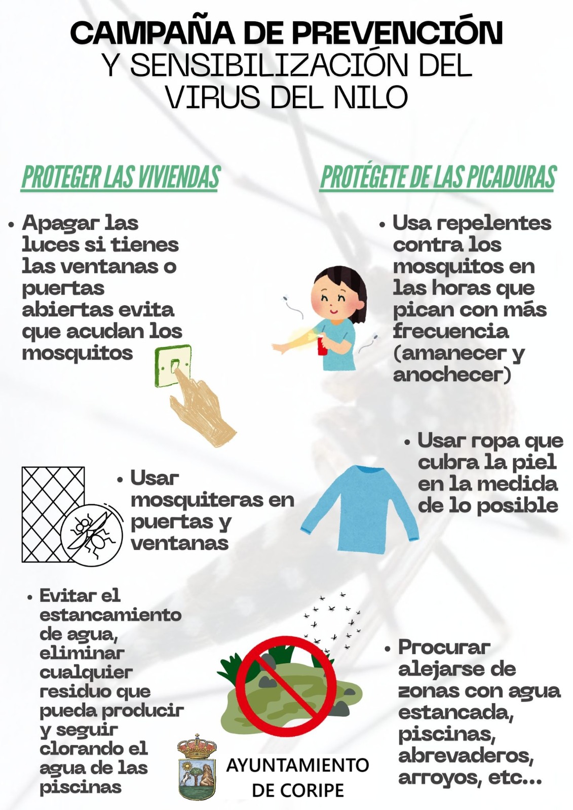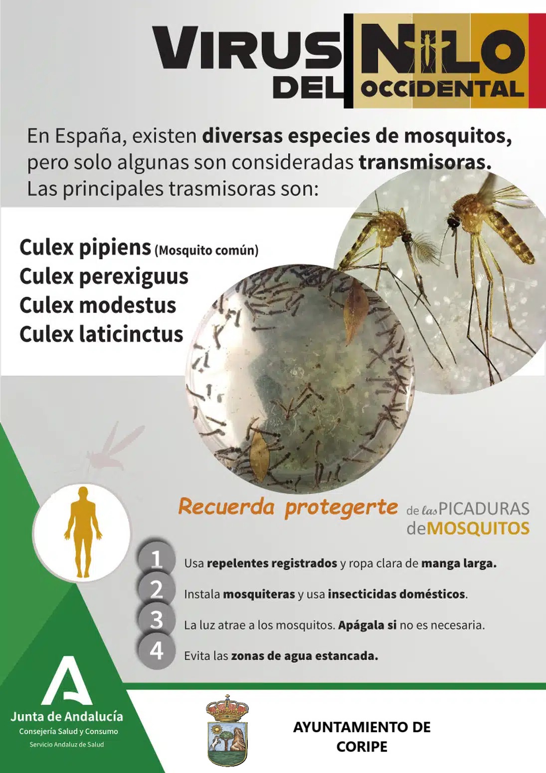 El Ayuntamiento de Coripe se suma a la campaña informativa de la Consejería de Salud y Consumo en materia de prevención del Virus del Nilo Occidental, que se transmite por la picadura de mosquitos, con el fin de concienciar y sensibilizar a la ciudadanía con distintas recomendaciones para protegerse de las picaduras y, además, ofrecer pautas para reducir la presencia de estos insectos en la zona.