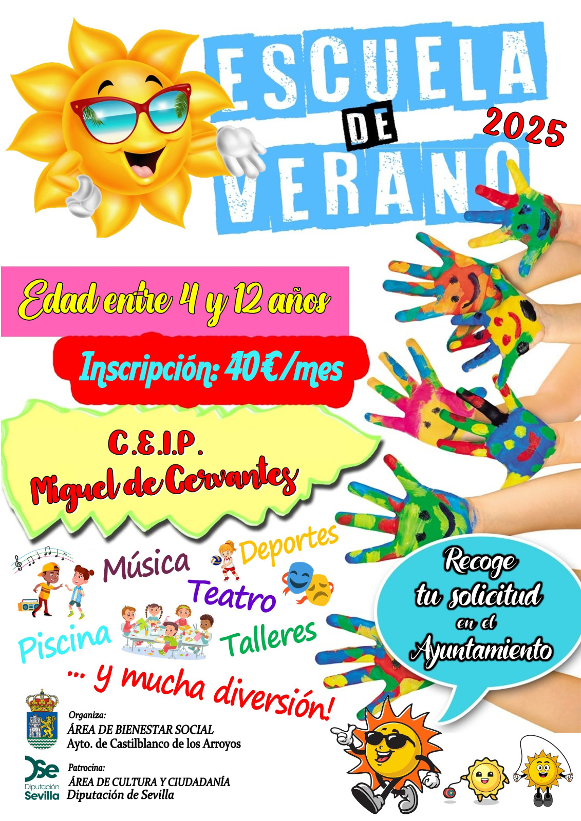 La Escuela de Verano atenderá a los menores de lunes a viernes en horario de 9:00 a 14:00 horas, en el CEIP Miguel de Cervantes. Además, incluye el servicio de aula matinal de 8:00 a 9:00 h para facilitar la conciliación laboral y familiar.